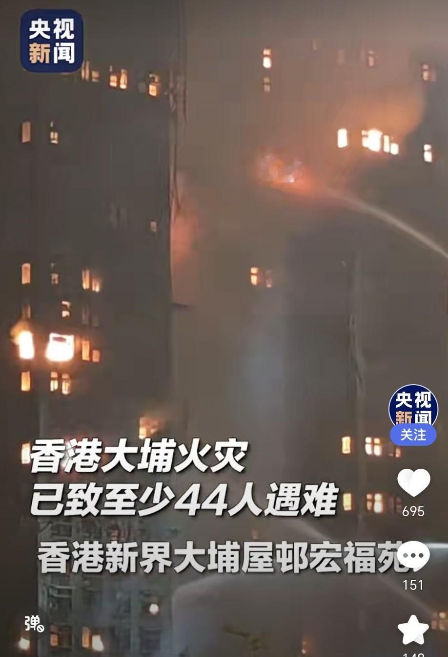 据央视新闻27日上午报道,香港大埔宏福苑火灾已造成至少44人遇难,279人失联。现场火情已经基本受控,目前首要工作是扑灭火情及救助伤者。 这场大火来的突然,也太无情,夺走了44条人命,还导致那么多人失联。此次火灾救援,消防人员也有伤亡,烈火英雄们不顾自身危险救人于水火,想想都觉得揪心。 火灾无情人有情,14亿同胞与你们同在,祖国是你们坚强的后盾,让我们众志成城、万众一心,战胜这次突发的火灾事故。向火灾事故遇难人员和殉职的消防员沉痛致哀!愿逝者安息!向冲锋在前的消防英雄们致敬! 此次火灾也给人们以警醒,生命至上,安全第一!这不是说说而已,无论任何场所,安全都是第一要务,不容小觑,且重于泰山!