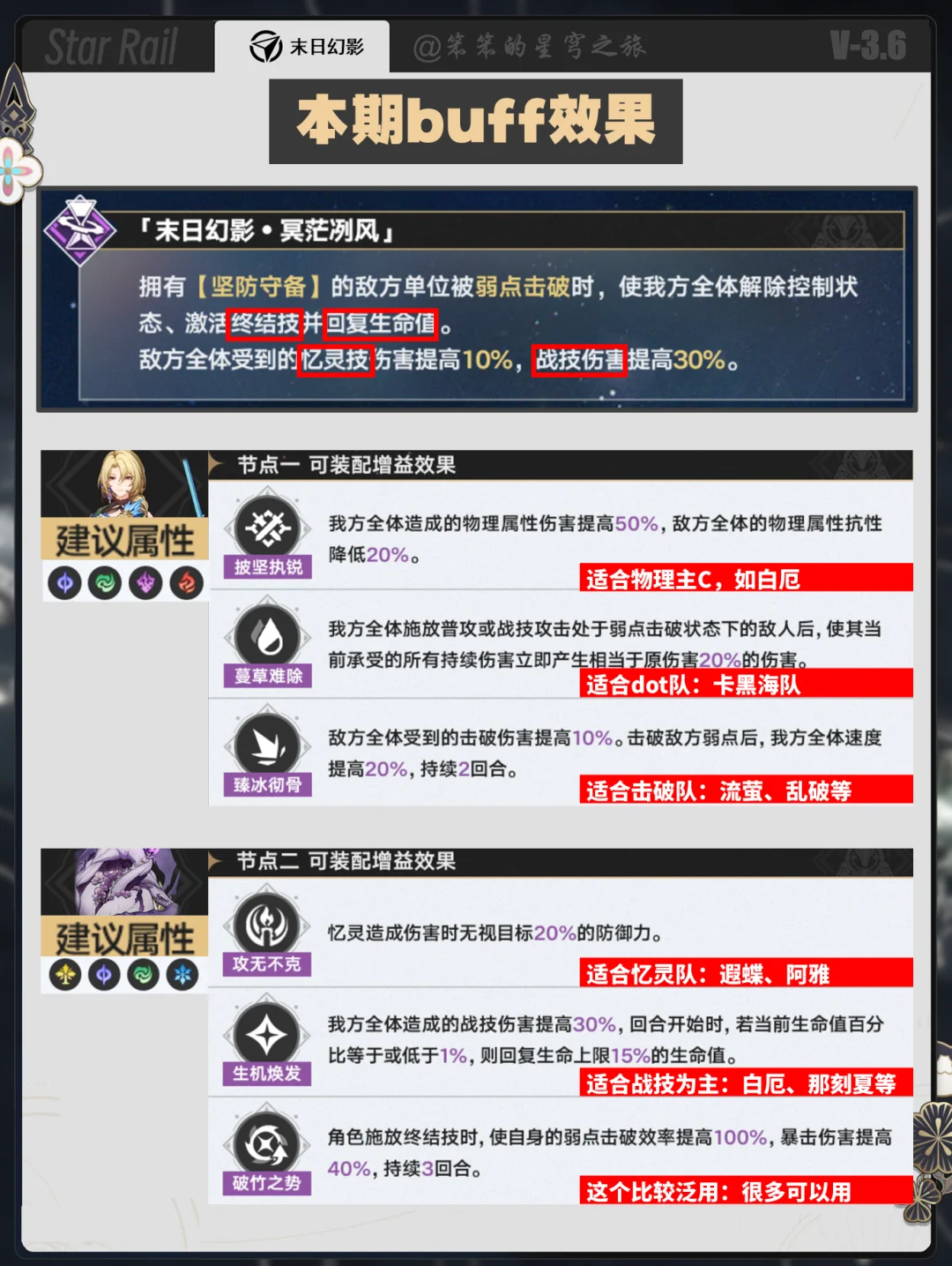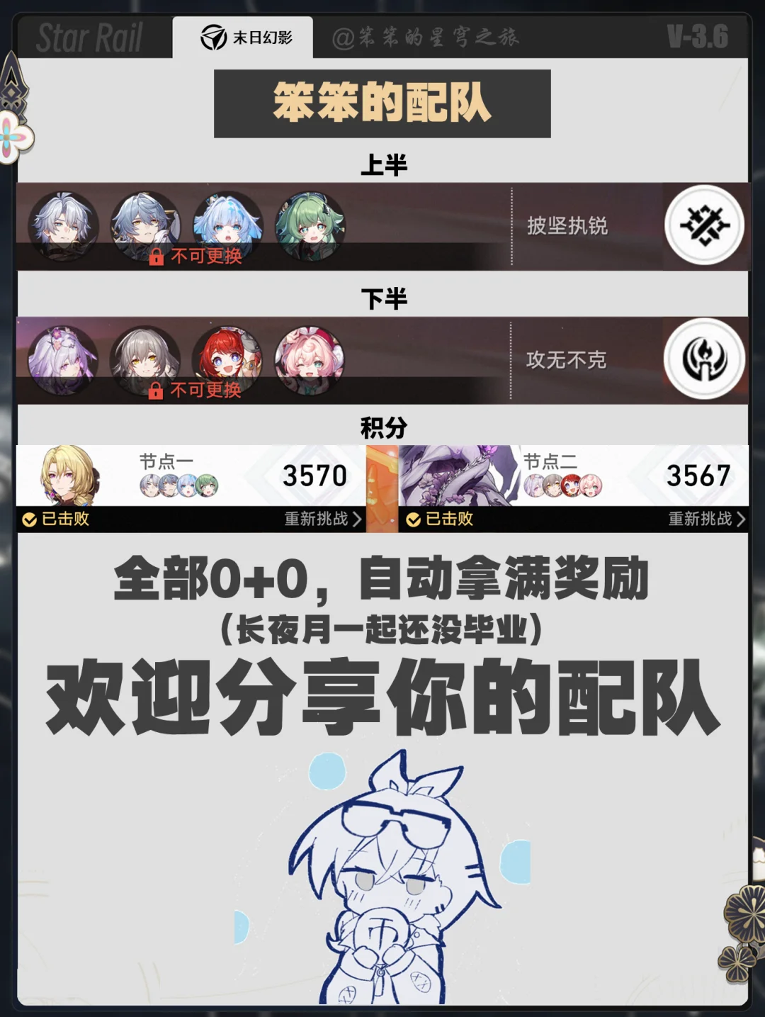 🐱大家好,我是笨笨的铲屎官 末日幻影更新了 本期忆灵和战技输出有增益 利好遐蝶和白厄等 推荐上半白厄,下半遐蝶 下半能挑选的队伍并不多 笨笨做了详细的罗列 希望对你有用哦 笨笨自己的长夜月还没毕业 所以遐蝶队并没有配长夜月 全员0+0自动通关的 你使用的配队是什么