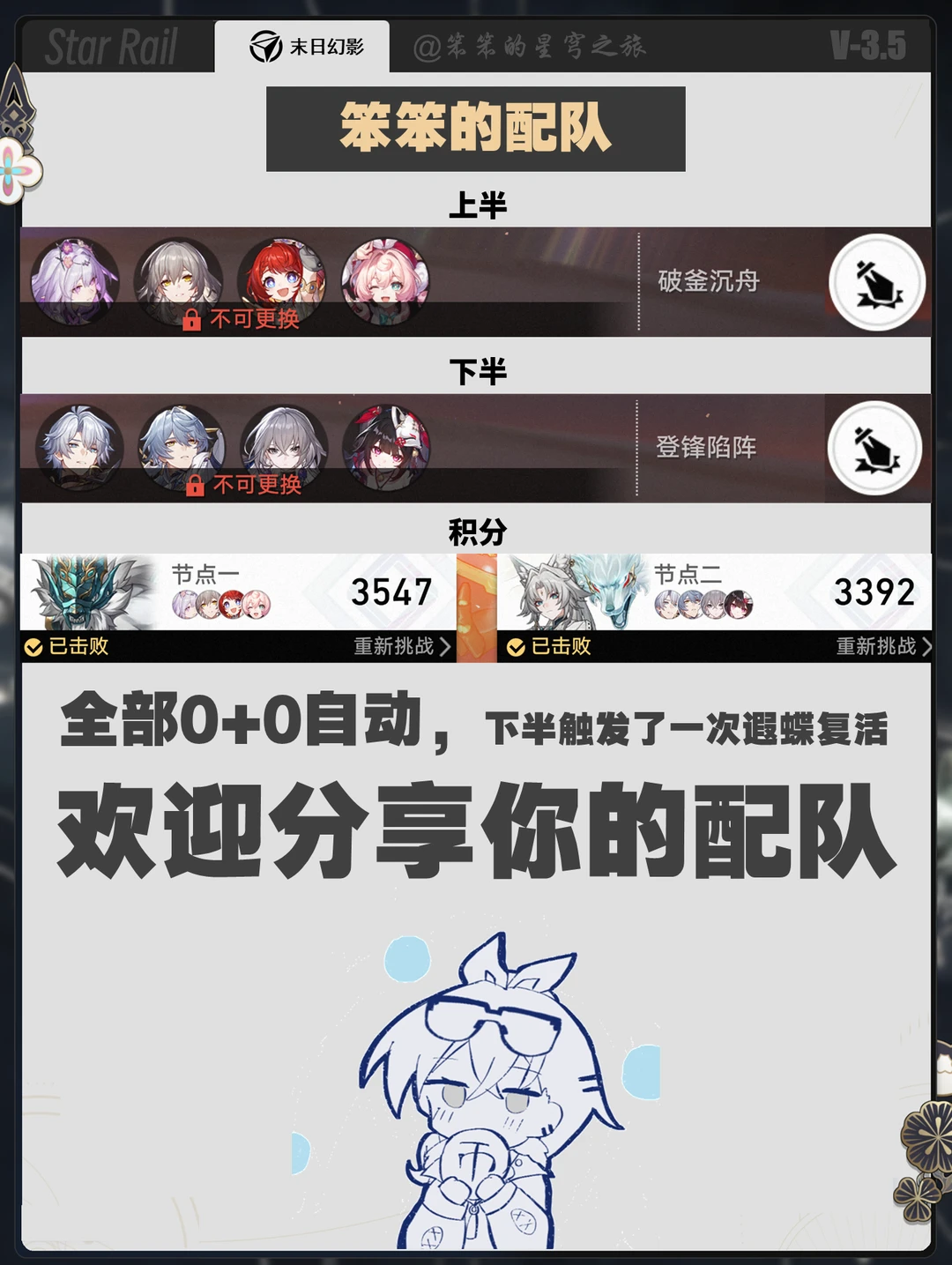 🐱大家好,我是笨笨的铲屎官 末日幻影更新了 DOT队总算是有环境了 本期白厄、遐蝶、卡海等 能用的队伍很多 笨笨做了详细的罗列 希望对你有用哦 笨笨自己的海瑟音还没毕业 所以用的遐蝶+白厄 全员0+0自动通关的 你使用的配队是什么