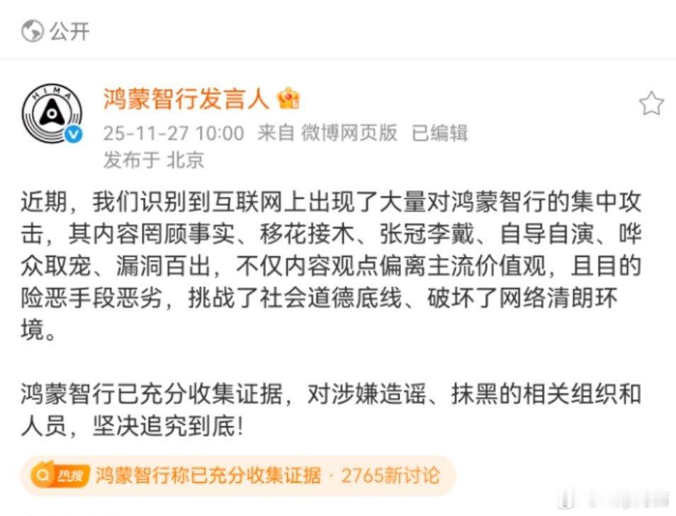 鸿蒙智行称已充分收集证据不管你是什么组织或者什么来头抹黑,造谣,攻击都是要付出代