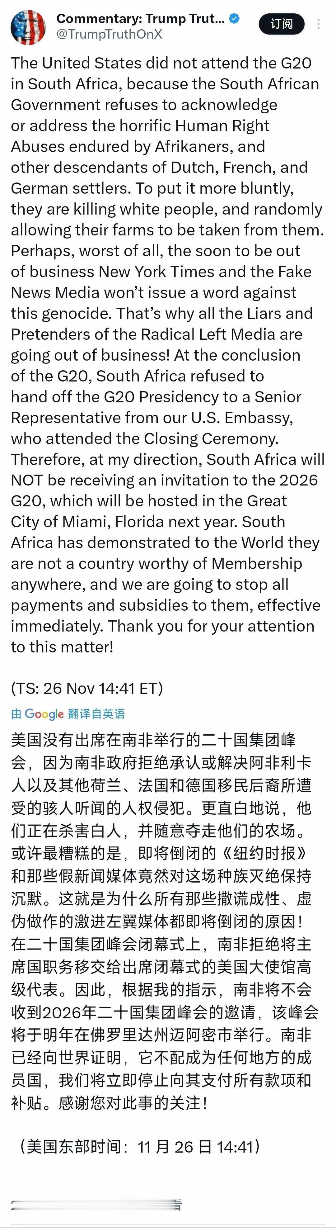 特朗普今天(北京时间11月27日)表示,明年的美国G20峰会,G20成员国南非将不会收到邀请。特朗普发文写道:“美国没有出席在南非举行的二十国集团峰会,因为南非政府拒绝承认或解决阿非利卡人以及其他荷兰、法国和德国移民后裔所遭受的骇人听闻的人权侵犯。更直白地说,他们正在杀害白人,并随意夺走他们的农场。或许最糟糕的是,即将倒闭的《纽约时报》和那些假新闻媒体竟然对这场种族灭绝保持沉默。 G20是1999年成立的国际经济合作论坛,成员国由5个小组轮流担任东道主,南非作为第四小组成员,是合法的G20成员国。 特朗普的指责毫无事实依据,南非总统拉马福萨已明确否认“种族屠杀”说法,美方始终未能拿出任何有效证据。 此次风波背后另有隐情,南非举办的G20峰会闭幕式上,因美方未按惯例派高级别代表参会,南非拒绝与美使馆临时代办完成主席国交接。 美国今年已多次针对南非,先是以《征用法案》为由切断援助,后驱逐南非驻美大使,两国关系持续紧张。 5月已有59名南非白人以“难民”身份抵达美国,特朗普声称接纳他们是因“种族迫害”,却无视全球更多战乱饥荒难民。 南非《征用法案》旨在解决历史遗留的土地分配不公问题,并非针对特定种族,这一举措得到国内多数民众支持。 国际社会看得明白,特朗普的真实不满源于南非2023年12月起诉以色列在加沙实施种族灭绝,得罪了美国。 G20峰会本是多边合作平台,美国作为下任轮值主席国,单方面拒绝邀请成员国,违背了论坛的非正式对话机制初衷。 南非政府回应称,美方决定基于不实信息和扭曲内容,令人遗憾,己方为改善对美关系已做大量努力。 今年南非G20峰会开幕当日就通过联合宣言,这是G20首次实现这一突破,恰恰是因为顶住了美国的胁迫。 特朗普口中的“假新闻”其实是客观报道,国际媒体未跟风炒作“种族灭绝”,是因为看穿了美方的政治操弄。 这种单边制裁式的外交手段,正在破坏全球治理体系。G20的价值在于包容合作,而非某国的“一言堂”。 南非作为非洲大陆的重要经济体,在G20中代表着发展中国家的声音,美方的做法伤害了广大发展中国家的利益。 历史上南非曾遭受种族隔离的苦难,如今致力于种族平等,国际社会有目共睹,绝非特朗普口中的“人权侵犯者”。 美国国务院年度人权报告指责南非人权状况“恶化”,被南非官员驳斥为毫无依据,纯粹是政治偏见。 特朗普的举动本质是“胁迫外交”,试图通过施压让南非向美方靠拢,这种霸权行径已遭到国际社会的隐性抵制。 多边主义才是时代潮流,任何企图以单边行动破坏国际合作的做法,最终都会损害自身的国际信誉。 我们坚信,国际社会不会被虚假言论误导,南非的正当权益将得到多数国家的支持,G20的合作初心不会被个别国家扭曲。高市早苗为何敢对中国“口出狂言” 麻烦看官老爷们右上角点击一下“关注”,既方便您进行讨论和分享,又能给您带来不一样的参与感,感谢您的支持! 各位读者你们怎么看?欢迎在评论区讨论。