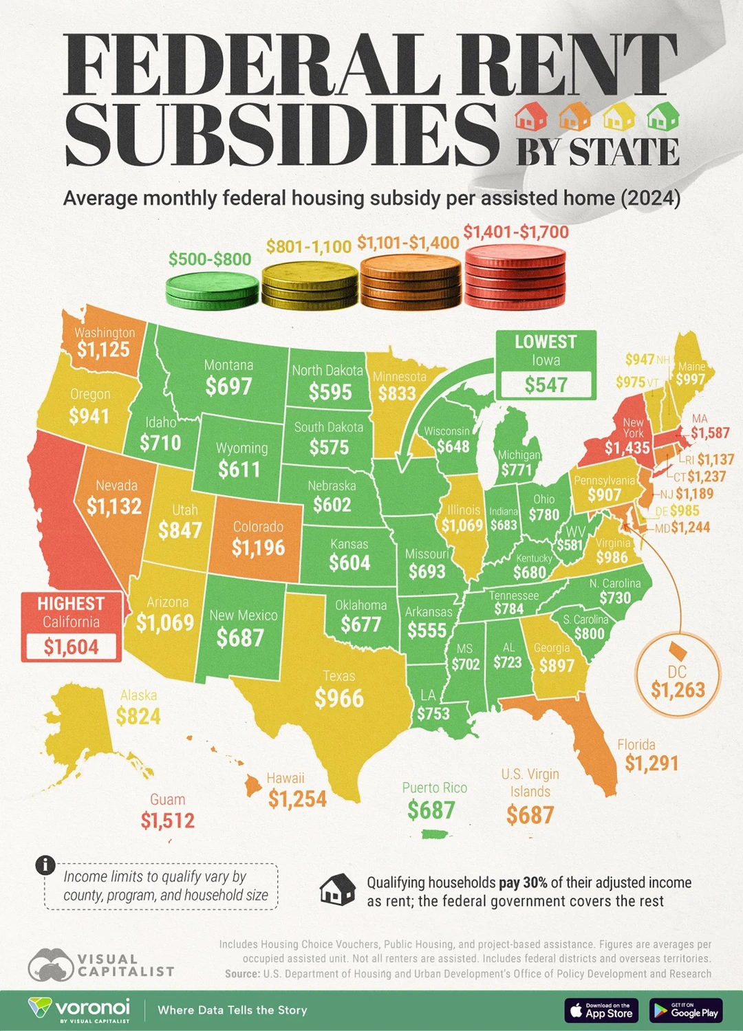 这张图展示了美国各州在 2024 年中,平均每户所获得的联邦住房补贴金额。补贴主要来自住房选择券、公屋项目和特定的租房援助计划。符合资格的家庭一般只需支出收入的 30% 用于房租,其余由联邦政府承担。