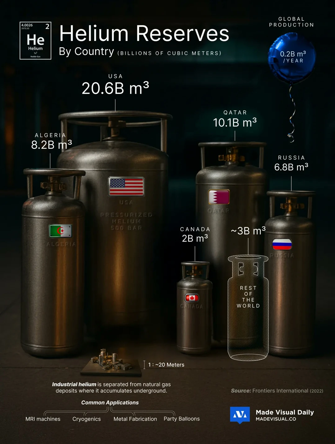 美国拥有全球最大氦气储备,达到 20.6 亿立方米,几乎等于其他主要国家加起来。这使得美国长期掌控全球供应,成为医疗、科研、高端制造背后最关键的隐形力量。