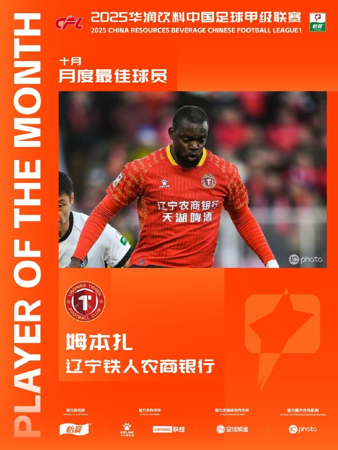 10月份,辽宁铁人外援姆本扎出战4场联赛打入6球,并两度当选全场最佳,凭借如此表现,这位锋线球员当选为中甲10月最佳球员。