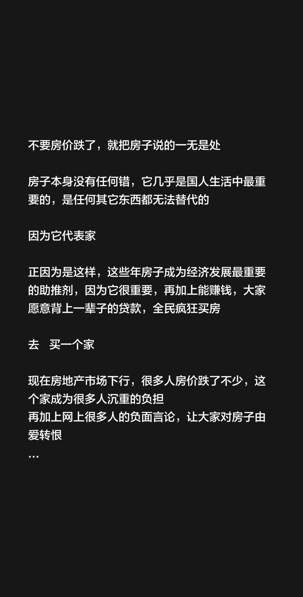 不要房价跌了,就把房子说的一无是处房子本身没有任何错,它几乎是国人生活中最重要的,是任何其它东西都无法替代的因为它代表家正因为是这样,这些年房子成为经济发展最重要的助推剂,因为它很重要,再加上能赚钱,大家愿意背上一辈子的贷款,全民疯狂买房去 买一个家现在房地产市场下行,很多人房价跌了不少,这个家成为很多人沉重的负担再加上网上很多人的负面言论,让大家对房子由爱转恨真的没必要,大家以后正确看待房子就行把它当成家来看待,让房子回归它该承担的角色没买的,现在很多房子足够便宜买了的,就当自己做生意失败了,不要再管在想房子的任何事说好听的叫往前看,说不好听的,你想再多也回不去,也改变不了什么
