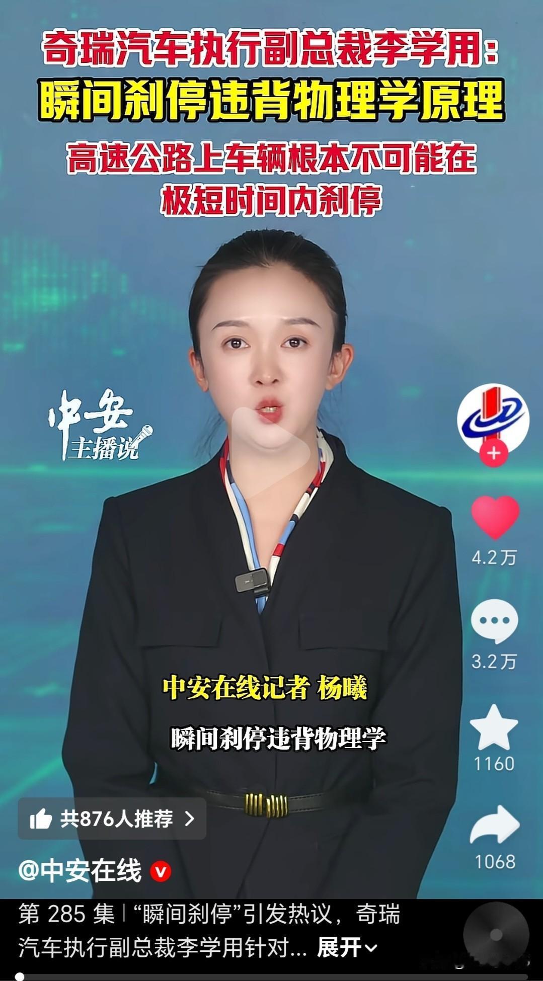 汽车不可能在200公里能瞬间刹停车,这不是我说的,中安在线说的,中安在线说奇瑞副总裁说的。 其实不管谁说的,超过了物理极限,怎么可能做到200公里瞬间刹停,汽车要以安全去宣传,而不这种宣传,看看一系列的交通事故…