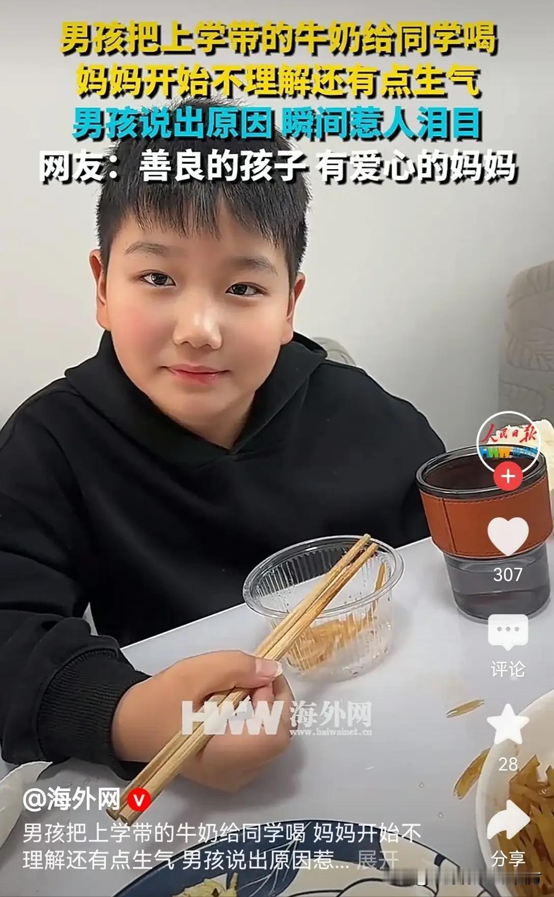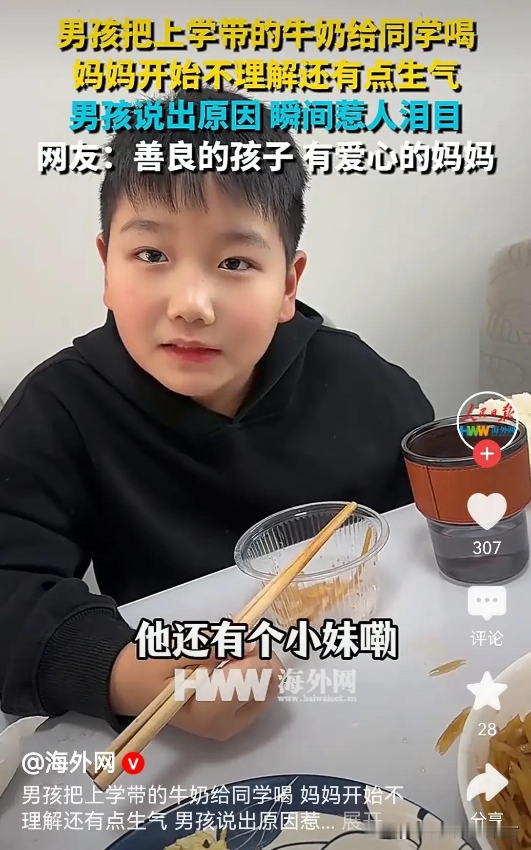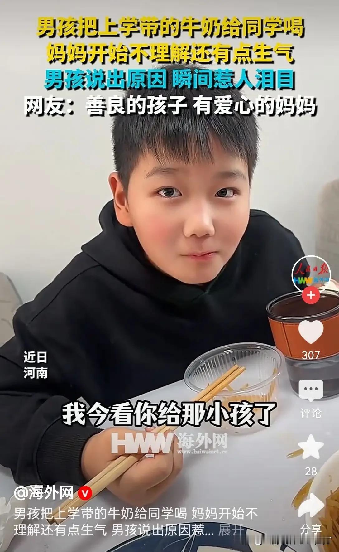 河南男孩把牛奶全送给同学, 妈妈追问后泪崩: 原来善良真的会传染! “这孩子最近太反常了!”河南一位妈妈发现,特意给长身高的儿子买的牛奶,他居然一口没喝,全偷偷送给了同学。 妈妈越想越揪心:这款牛奶儿子在家爱喝到抢着喝,怎么到了学校就大方送人?难道是被同学欺负、被迫讨好?实在坐不住的她,拉着儿子追问:“是不是有人逼你送的?咱可不能吃亏!” 没想到儿子仰起小脸,认真地摇摇头:“是我自己要给的呀。” “他妈妈不会给他买吗?”妈妈还是不解。 儿子的一句话让她瞬间愣住:“他没有妈妈……” 妈妈鼻子一酸,刚想心疼孩子的懂事,儿子却歪着头补了一句:“妈妈,明天能让我带三盒牛奶吗?” “两盒够你们俩喝了,为啥要三盒?”妈妈更纳闷了。 “他还有个小妹,我之前送他的牛奶,他都舍不得喝,全带回家给小妹了!” 话音刚落,妈妈的眼泪再也忍不住了。她以为儿子只是单纯分享,却没想到这小小的牛奶里,藏着两个孩子最纯粹的温柔——一个愿意把自己的补给分给缺爱的同学,一个宁愿自己饿着也要疼妹妹。 此事刷屏后,网友的留言看哭了无数人: - “我要有这样的儿子,就算成绩平平又怎样?这颗金子般的心,比任何奖状都珍贵!” - “想起我儿子,小学三年订的牛奶全给了没妈妈的同学,直到同学转走他不愿订了,我才知道真相,偷偷哭了好久!” - “谁懂‘他没有妈妈’这句话的杀伤力?我从小没妈,能被人这样惦记着,真的会记一辈子啊!” 后来妈妈哽咽着告诉儿子:“以后每天带三盒,你、他、小妹一人一盒,妈妈管够!” 她没责骂儿子“自作主张”,反而全力守护这份善意——这份包容,才是给孩子最好的教育。 如今太多家长教孩子“别吃亏”“少管闲事”,可这个河南男孩用行动告诉我们:真正的教养,从不是精于算计的聪明,而是看见他人难处时,自然流淌的悲悯。 他或许不懂什么大道理,却用最直白的方式诠释了善良:把自己的偏爱分给缺爱的人,把别人的牵挂记在心里。而那位妈妈更让人动容,她没有用“吃亏”绑架孩子的善意,反而用一句“管够”,让这份温暖有了延续的底气。 善良从来不是单方面的付出,而是一颗心温暖另一颗心。愿这个揣着热乎真心的小男孩,永远被世界温柔以待;也愿每个家长都能明白:给孩子最好的礼物,不是满分的成绩,而是让他永远保持这份不掺杂质的善良。 这样的孩子,无论未来走多远,都自带光芒;这样的教育,才是孩子一生最宝贵的财富! 河南暖心男孩 河南送牛奶 河南男孩善举 河南小孩牛奶 小学生倒牛奶