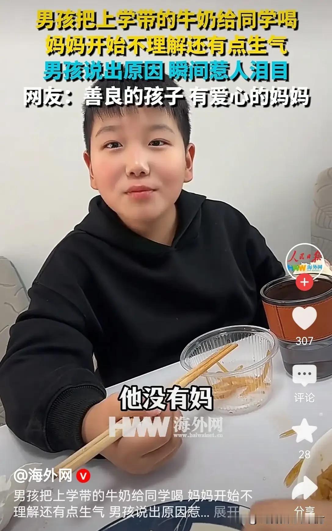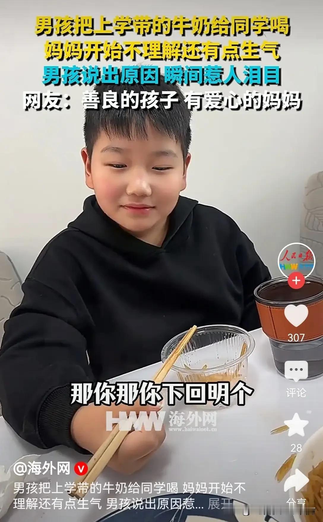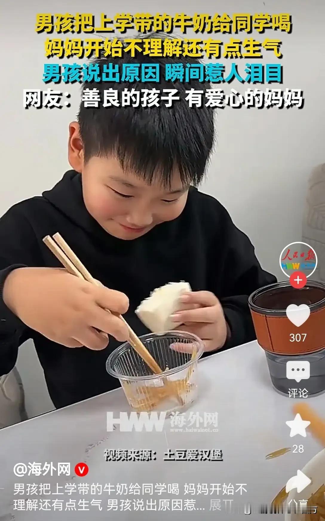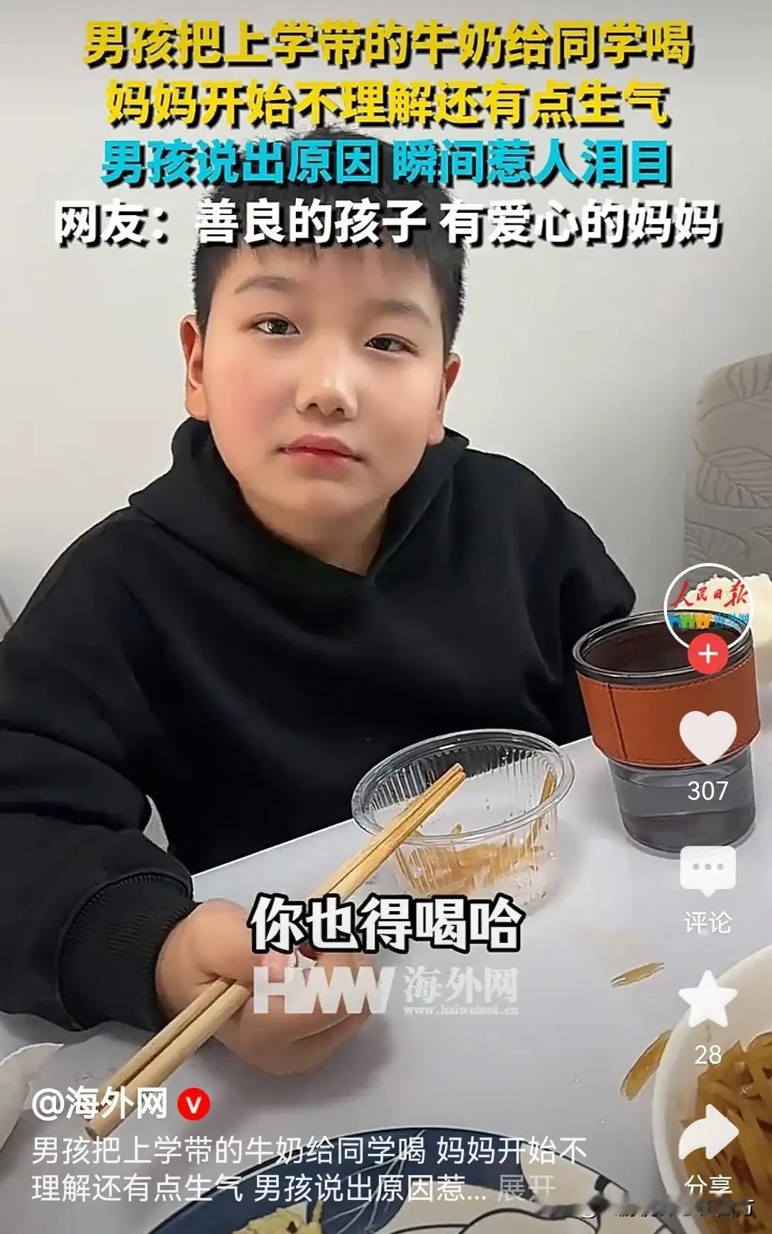 河南男孩把牛奶全送给同学, 妈妈追问后泪崩: 原来善良真的会传染! “这孩子最近太反常了!”河南一位妈妈发现,特意给长身高的儿子买的牛奶,他居然一口没喝,全偷偷送给了同学。 妈妈越想越揪心:这款牛奶儿子在家爱喝到抢着喝,怎么到了学校就大方送人?难道是被同学欺负、被迫讨好?实在坐不住的她,拉着儿子追问:“是不是有人逼你送的?咱可不能吃亏!” 没想到儿子仰起小脸,认真地摇摇头:“是我自己要给的呀。” “他妈妈不会给他买吗?”妈妈还是不解。 儿子的一句话让她瞬间愣住:“他没有妈妈……” 妈妈鼻子一酸,刚想心疼孩子的懂事,儿子却歪着头补了一句:“妈妈,明天能让我带三盒牛奶吗?” “两盒够你们俩喝了,为啥要三盒?”妈妈更纳闷了。 “他还有个小妹,我之前送他的牛奶,他都舍不得喝,全带回家给小妹了!” 话音刚落,妈妈的眼泪再也忍不住了。她以为儿子只是单纯分享,却没想到这小小的牛奶里,藏着两个孩子最纯粹的温柔——一个愿意把自己的补给分给缺爱的同学,一个宁愿自己饿着也要疼妹妹。 此事刷屏后,网友的留言看哭了无数人: - “我要有这样的儿子,就算成绩平平又怎样?这颗金子般的心,比任何奖状都珍贵!” - “想起我儿子,小学三年订的牛奶全给了没妈妈的同学,直到同学转走他不愿订了,我才知道真相,偷偷哭了好久!” - “谁懂‘他没有妈妈’这句话的杀伤力?我从小没妈,能被人这样惦记着,真的会记一辈子啊!” 后来妈妈哽咽着告诉儿子:“以后每天带三盒,你、他、小妹一人一盒,妈妈管够!” 她没责骂儿子“自作主张”,反而全力守护这份善意——这份包容,才是给孩子最好的教育。 如今太多家长教孩子“别吃亏”“少管闲事”,可这个河南男孩用行动告诉我们:真正的教养,从不是精于算计的聪明,而是看见他人难处时,自然流淌的悲悯。 他或许不懂什么大道理,却用最直白的方式诠释了善良:把自己的偏爱分给缺爱的人,把别人的牵挂记在心里。而那位妈妈更让人动容,她没有用“吃亏”绑架孩子的善意,反而用一句“管够”,让这份温暖有了延续的底气。 善良从来不是单方面的付出,而是一颗心温暖另一颗心。愿这个揣着热乎真心的小男孩,永远被世界温柔以待;也愿每个家长都能明白:给孩子最好的礼物,不是满分的成绩,而是让他永远保持这份不掺杂质的善良。 这样的孩子,无论未来走多远,都自带光芒;这样的教育,才是孩子一生最宝贵的财富! 河南暖心男孩 河南送牛奶 河南男孩善举 河南小孩牛奶 小学生倒牛奶