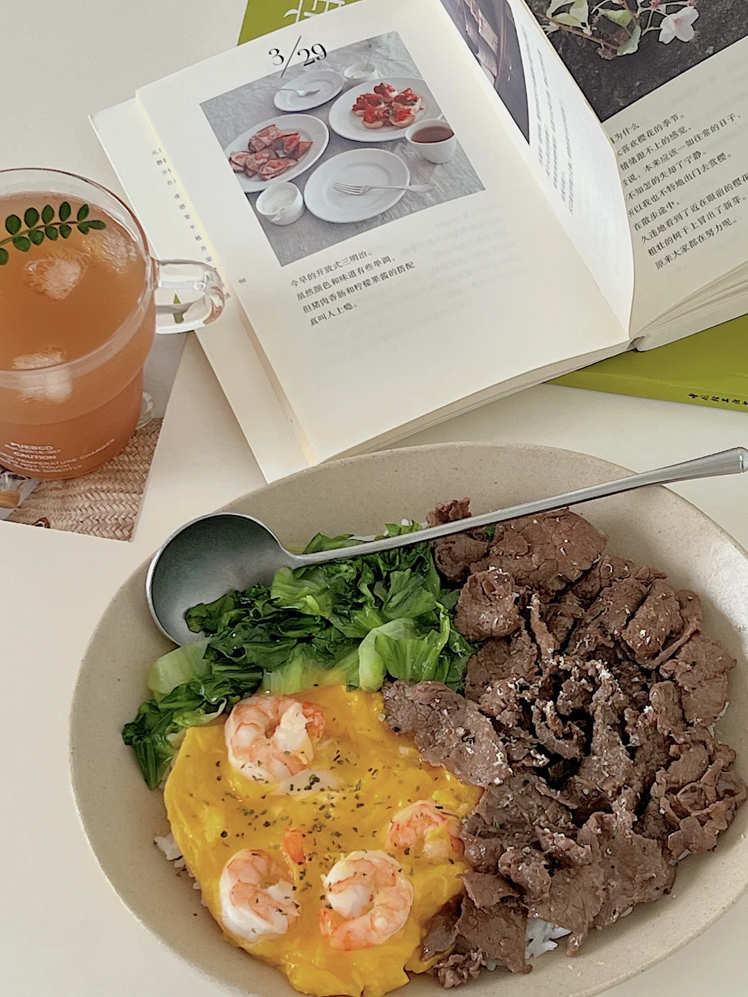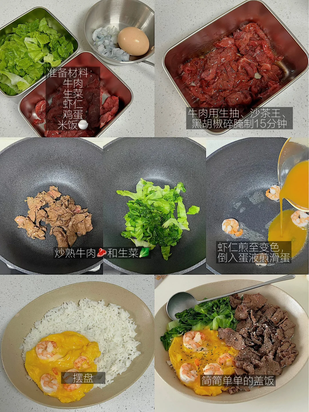 饭张力一人食来了挡也挡不住,随便咔擦几下就要享受吃饭啦 做法在图3️⃣ ✨牛肉用生抽、沙茶王、黑胡椒碎腌制15分钟,炒熟 ✨生菜炒熟备用 ✨虾仁煎至变色后,倒入蛋液,煎滑蛋 ✨摆盘,再来一杯柠檬茶🍋🟩 一人份家常菜,这个搭配不会错,快去做吧