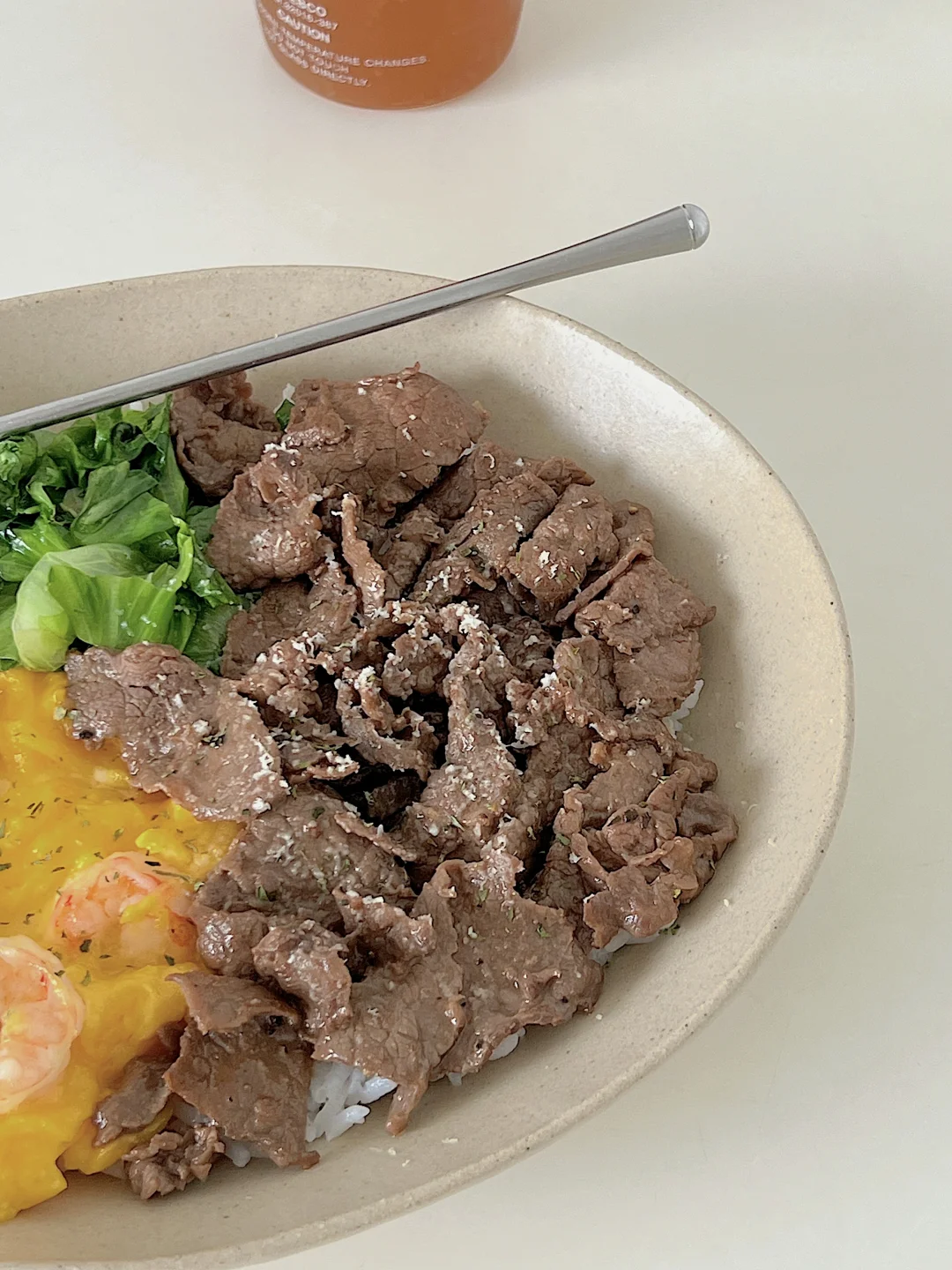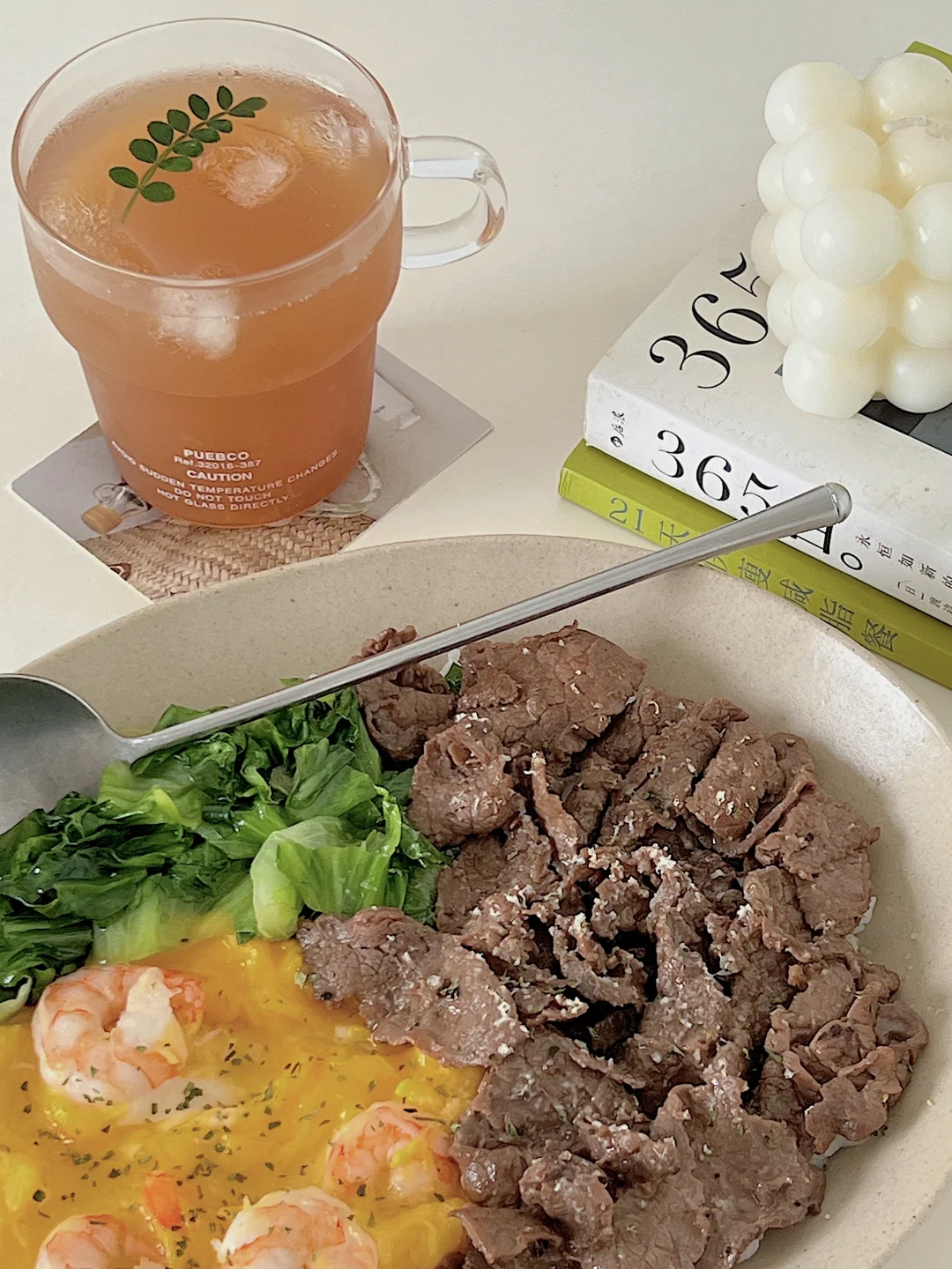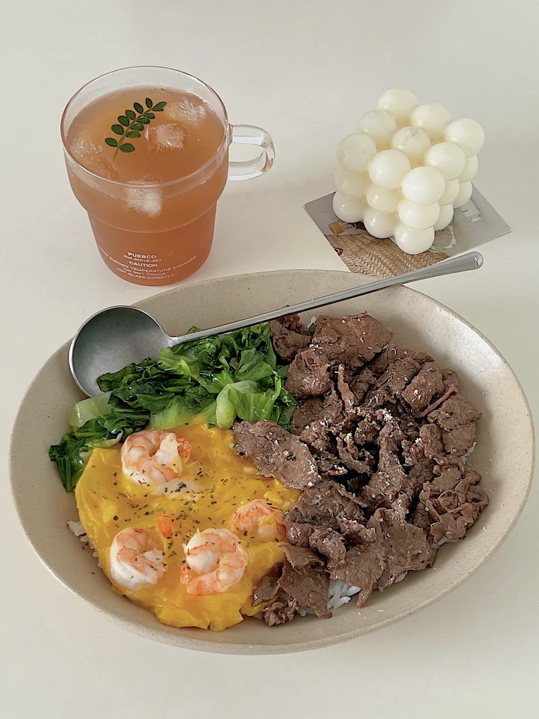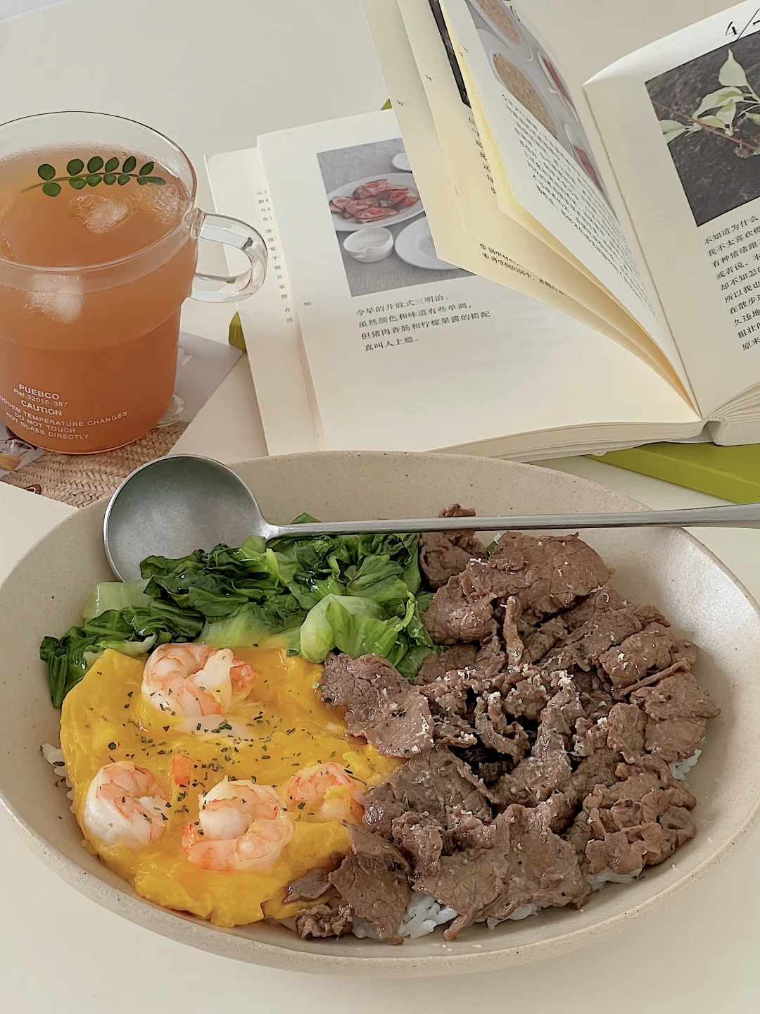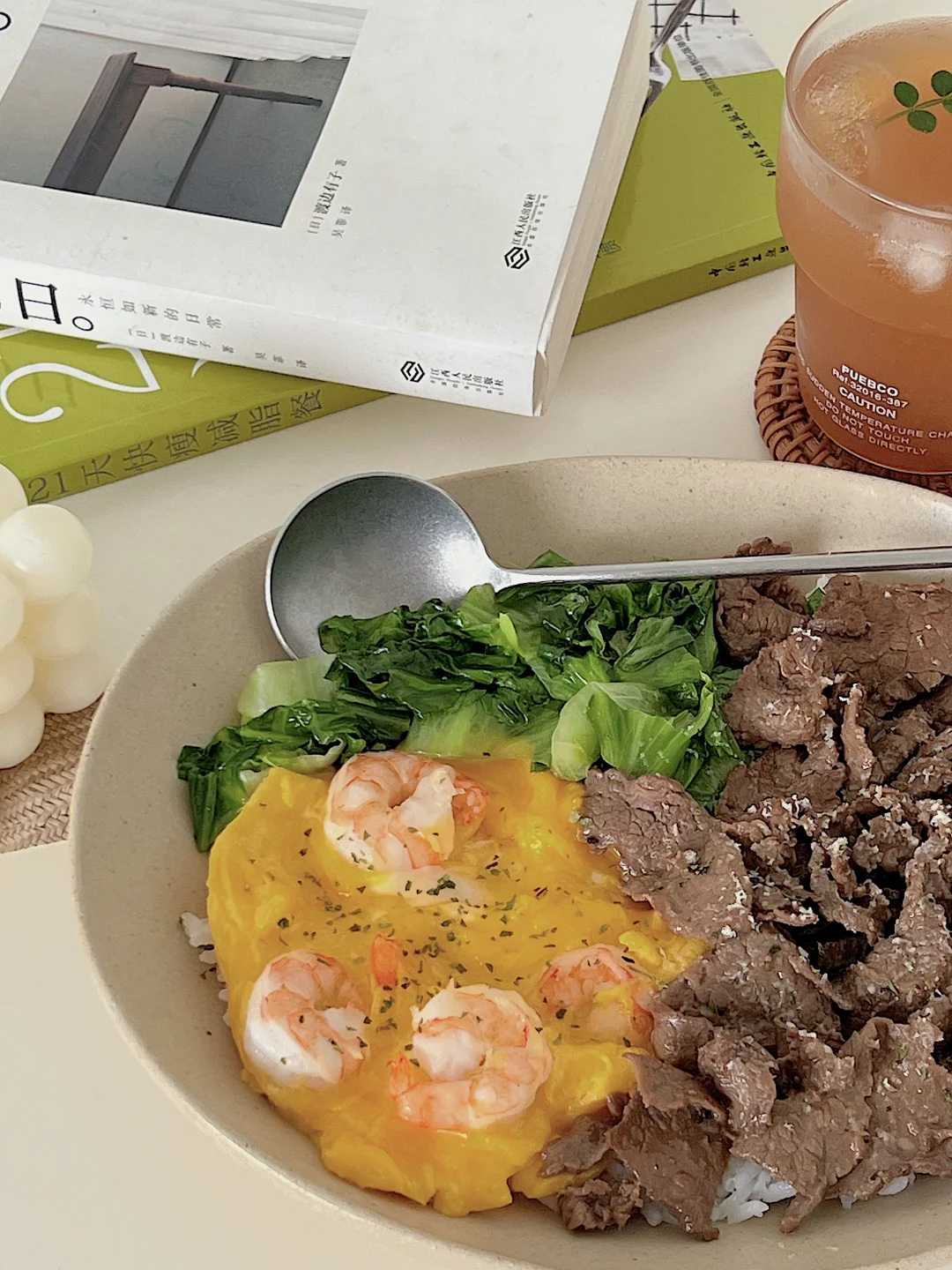 宅家一人食|牛肉生菜虾仁滑蛋盖饭🍱柠檬茶