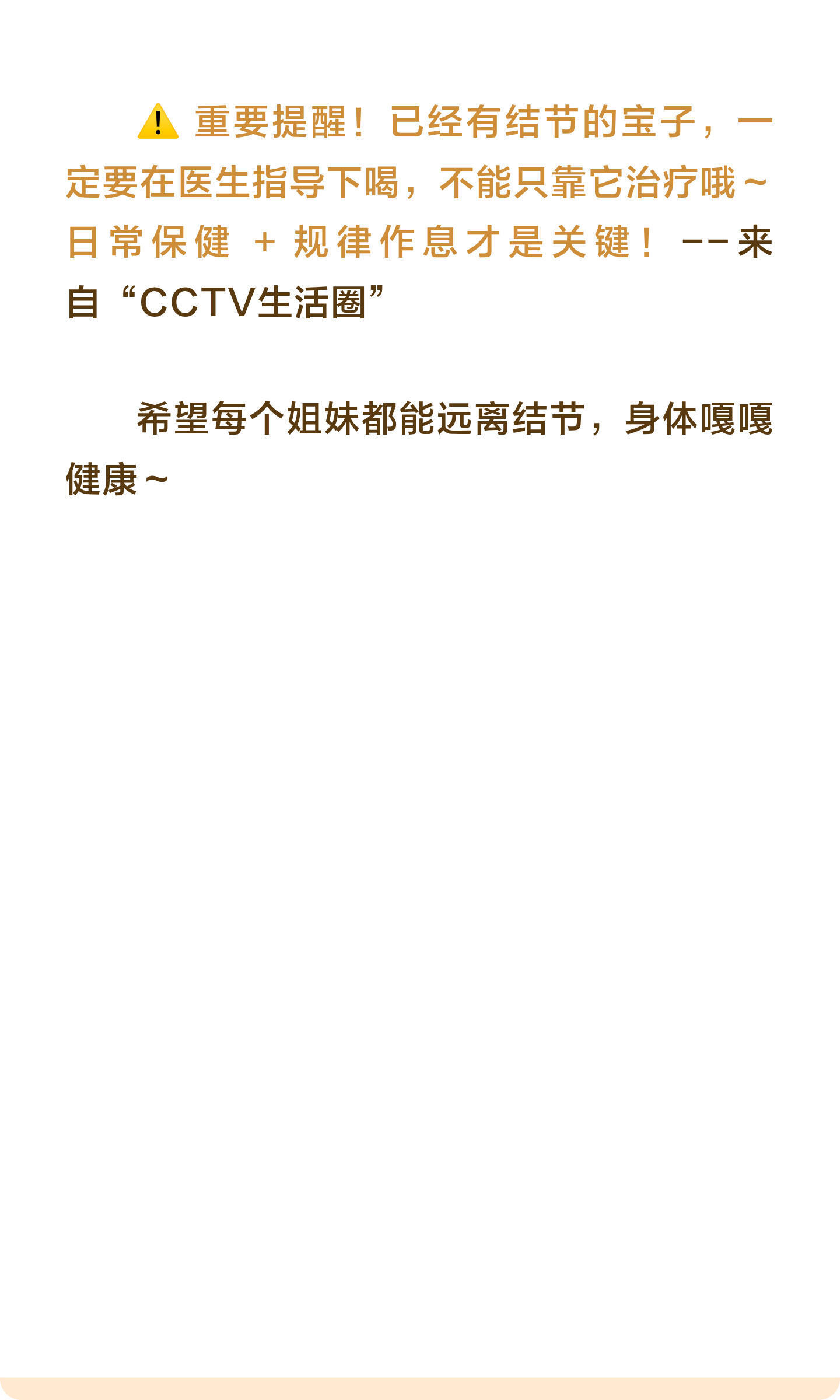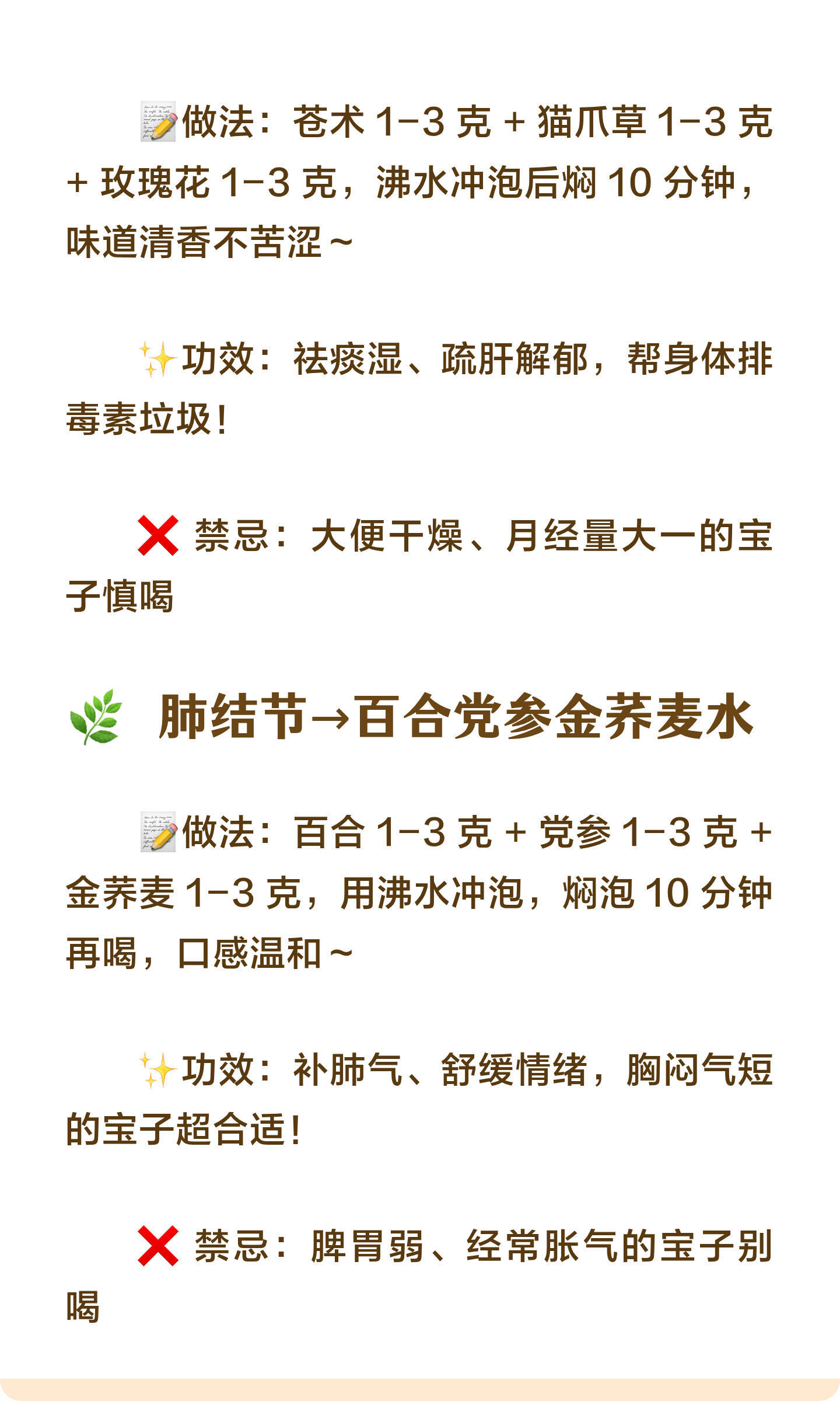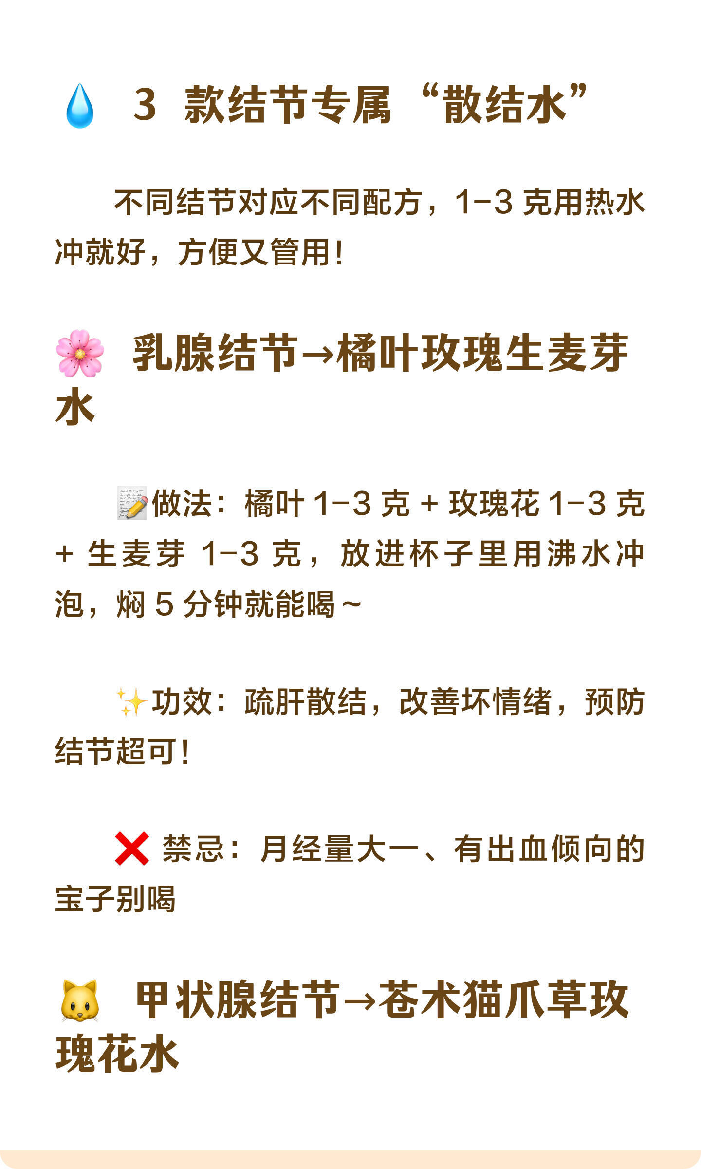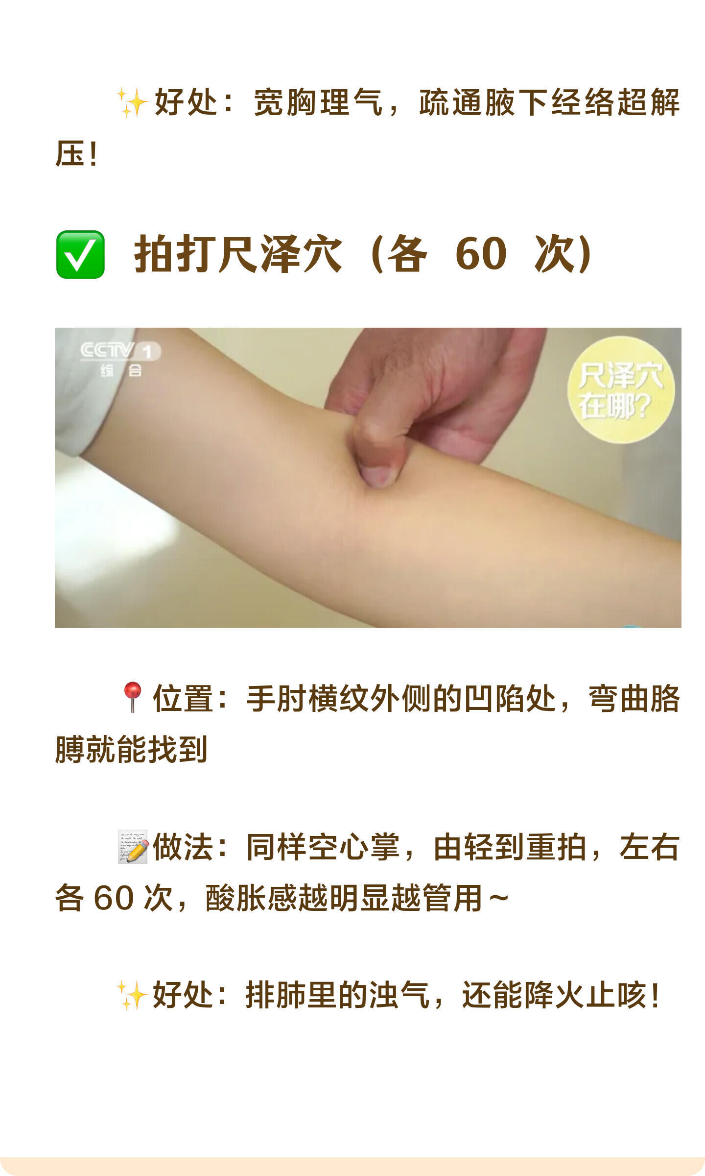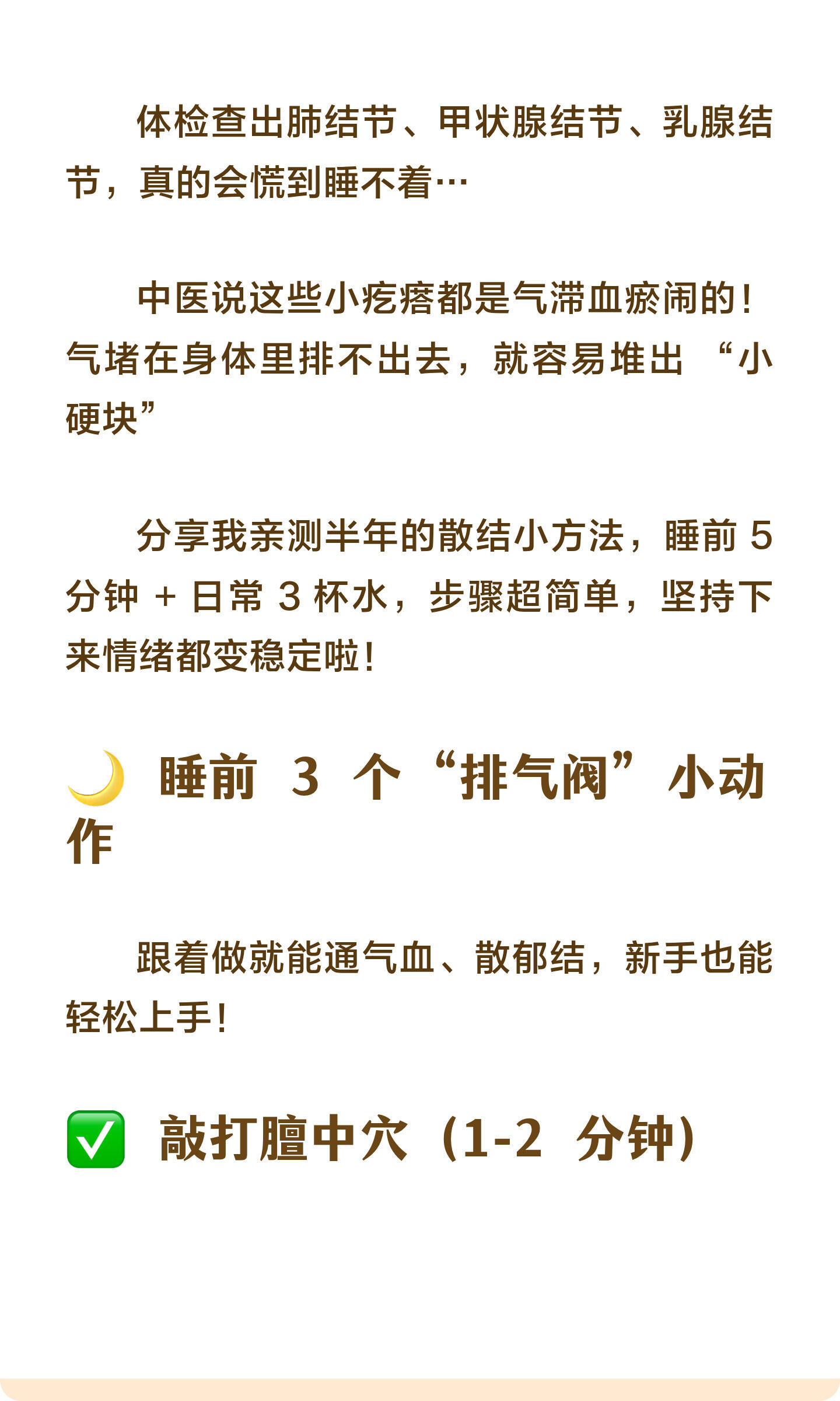 再大的结节,也怕这3个动作,每天睡前练一谁懂啊家人们!😭 体检查出肺结节、甲状腺结节、乳腺结节,真的会慌到睡不着…中医说这些小疙瘩都是气滞血瘀闹的!气堵在身体里排不出去,就容易堆出 “小硬块”睡前 5 分钟 + 日常 3 杯水,步骤超简单,坚持下来情绪都变稳定啦!🌙 睡前 3 个 “排气阀” 小动作跟着做就能通气血、散郁结,新手也能轻松上手!✅ 敲打膻中穴(1-2 分钟)📍位置:两乳连线和胸骨正中间的交点📝做法:双手合十,用大拇指根部轻轻敲打,力度以不疼为宜,敲够 1-2 分钟就好✨好处:缓解胸闷,坏情绪瞬间跑光!✅ 拍打极泉穴(各 60 次)📍位置:腋窝中央,能摸到腋动脉搏动的地方📝做法:手掌空心,由轻到重慢慢拍,左右各拍 60 次,拍到酸麻胀就对啦✨好处:宽胸理气,疏通腋下经络超解压!✅ 拍打尺泽穴(各 60 次)📍位置:手肘横纹外侧的凹陷处,弯曲胳膊就能找到📝做法:同样空心掌,由轻到重拍,左右各 60 次,酸胀感越明显越管用✨好处:排肺里的浊气,还能降火止咳!💧 3 款结节专属 “散结水”不同结节对应不同配方,1-3 克用热水冲就好,方便又管用!🌸 乳腺结节→橘叶玫瑰生麦芽水📝做法:橘叶 1-3 克 + 玫瑰花 1-3 克 + 生麦芽 1-3 克,放进杯子里用沸水冲泡,焖 5 分钟就能喝✨功效:疏肝散结,改善坏情绪,预防结节超可!❌ 禁忌:月经量大一、有出血倾向的宝子别喝🐱 甲状腺结节→苍术猫爪草玫瑰花水📝做法:苍术 1-3 克 + 猫爪草 1-3 克 + 玫瑰花 1-3 克,沸水冲泡后焖 10 分钟,味道清香不苦涩✨功效:祛痰湿、疏肝解郁,帮身体排毒素垃圾!❌ 禁忌:大便干燥、月经量大一的宝子慎喝🌿 肺结节→百合党参金荞麦水📝做法:百合 1-3 克 + 党参 1-3 克 + 金荞麦 1-3 克,用沸水冲泡,焖泡 10 分钟再喝,口感温和✨功效:补肺气、舒缓情绪,胸闷气短的宝子超合适!❌ 禁忌:脾胃弱、经常胀气的宝子别喝⚠️ 重要提醒!已经有结节的宝子,一定要在医生指导下喝,不能只靠它治疗哦~ 日常保健 + 规律作息才是关键!--来自“CCTV生活圈”希望每个姐妹都能远离结节,身体嘎嘎健康~💪中医散结乳腺结节甲状腺结节肺结节