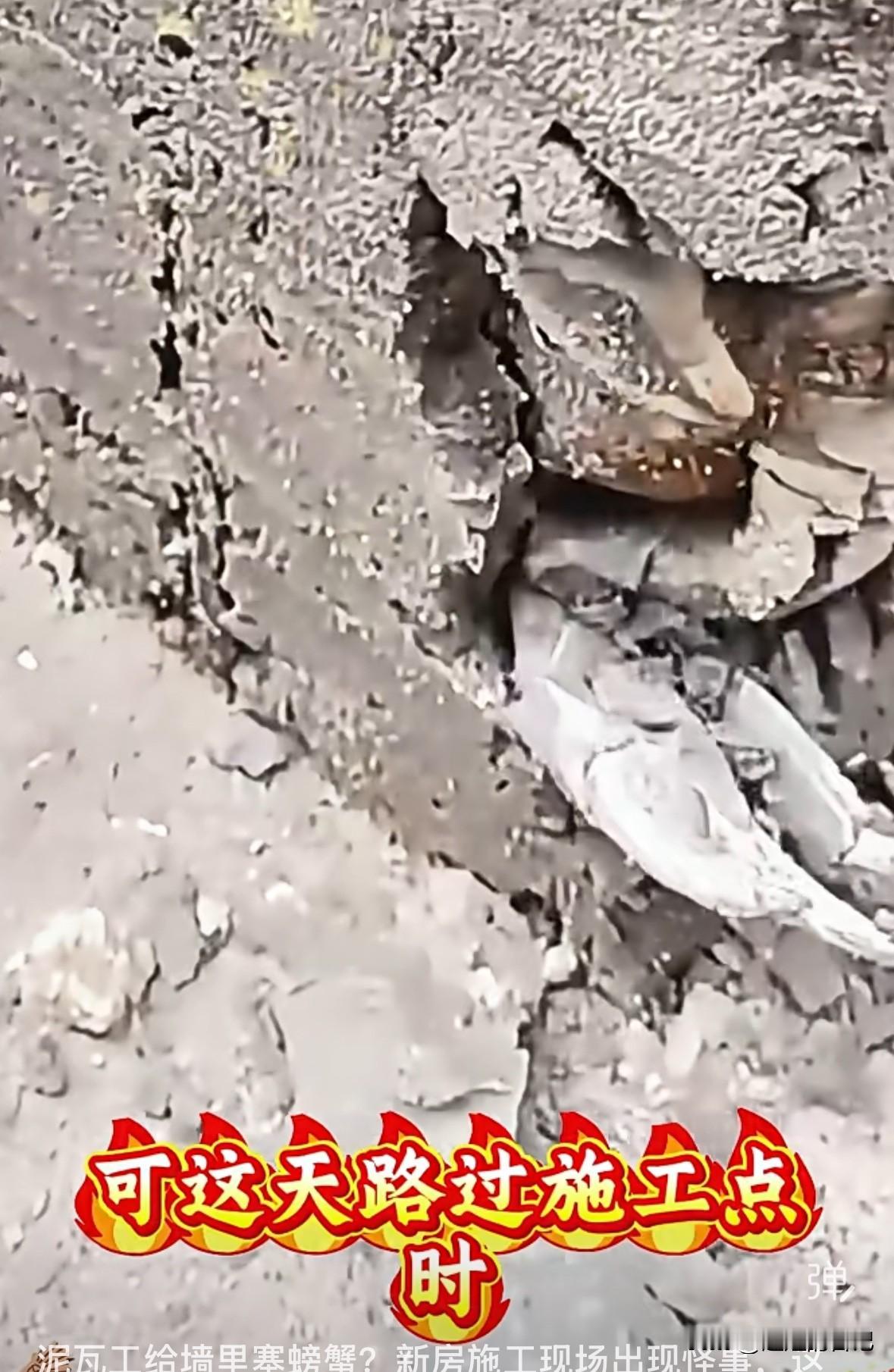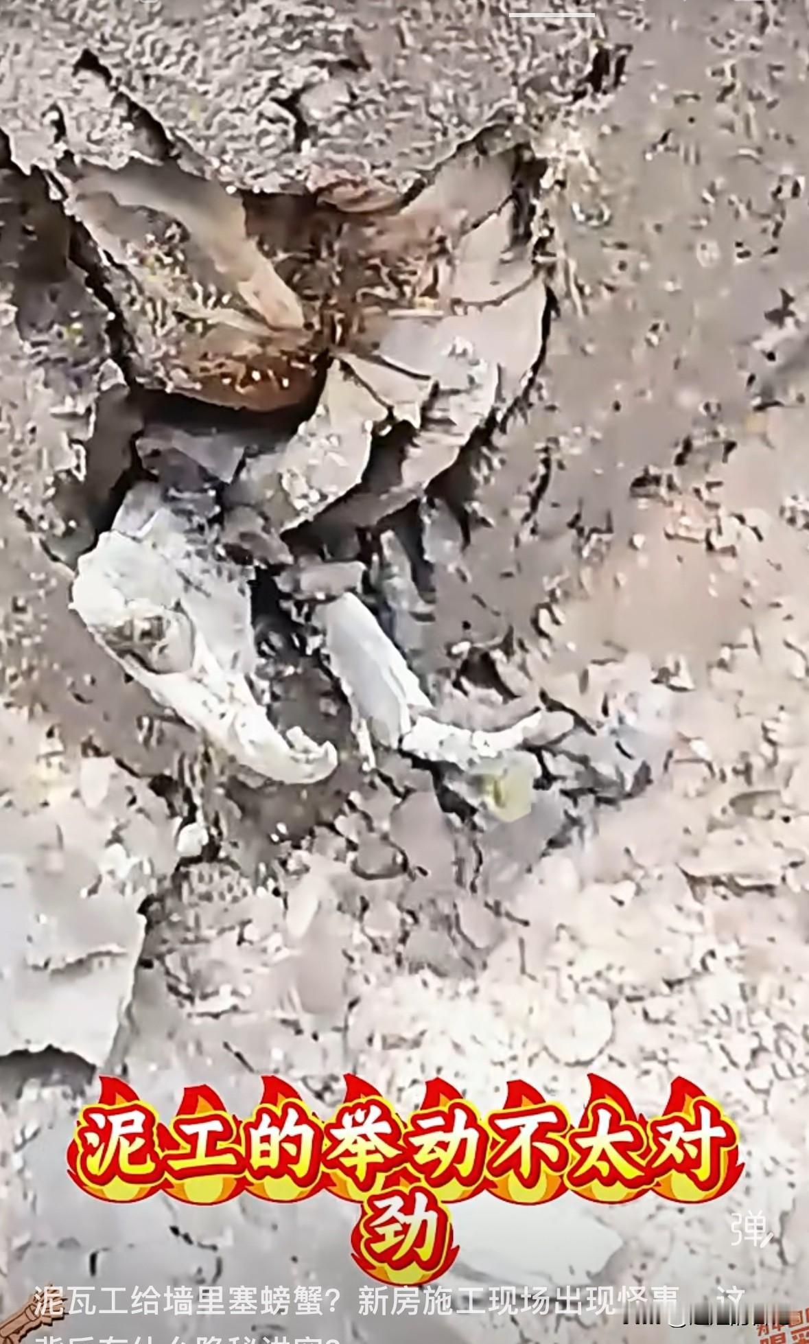 工人在新盖的房子里,砌进一只螃蟹是啥意思,我也是第一次听说。 刚才挂刷到一个视频,视频里讲的事情真是太让人震惊了。 事情经过是,主人请了工人盖房子,有一天偶然看到一个工人鬼鬼祟祟的好像往墙里放了什么东西,等这个工人走后,主人去查看发现有个东西还在动。主人用锤子把覆盖在它身上的水泥敲掉,发现是一只螃蟹。 往墙里放螃蟹我还是第一次听说,是有什么好的寓意么?真是搞不懂,你们有知道的么?