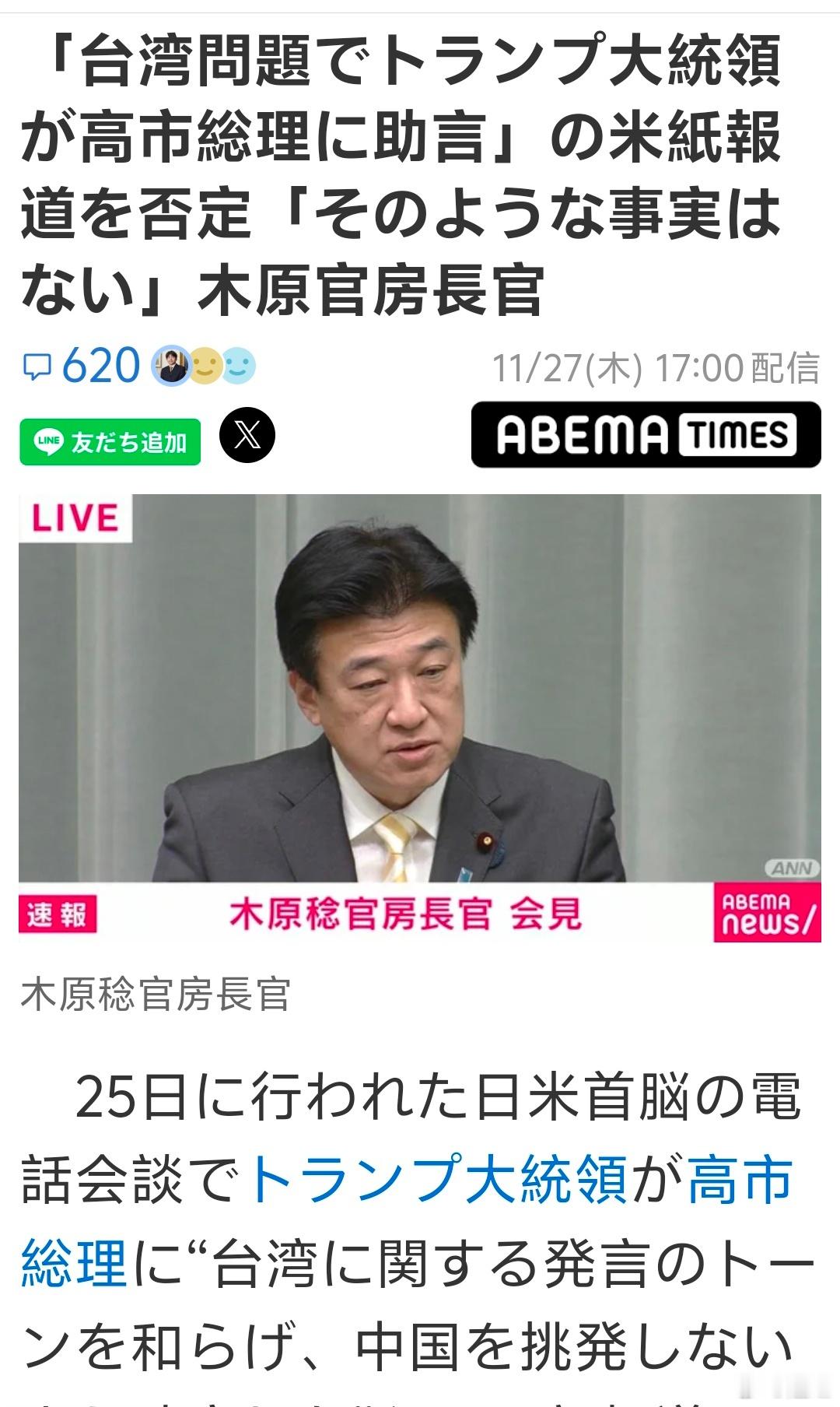 特朗普施压高市别在台湾问题上挑衅下午日本官防长官木原已经否认了华尔街日报的报道。 上午说不便回答无可奉告来着。