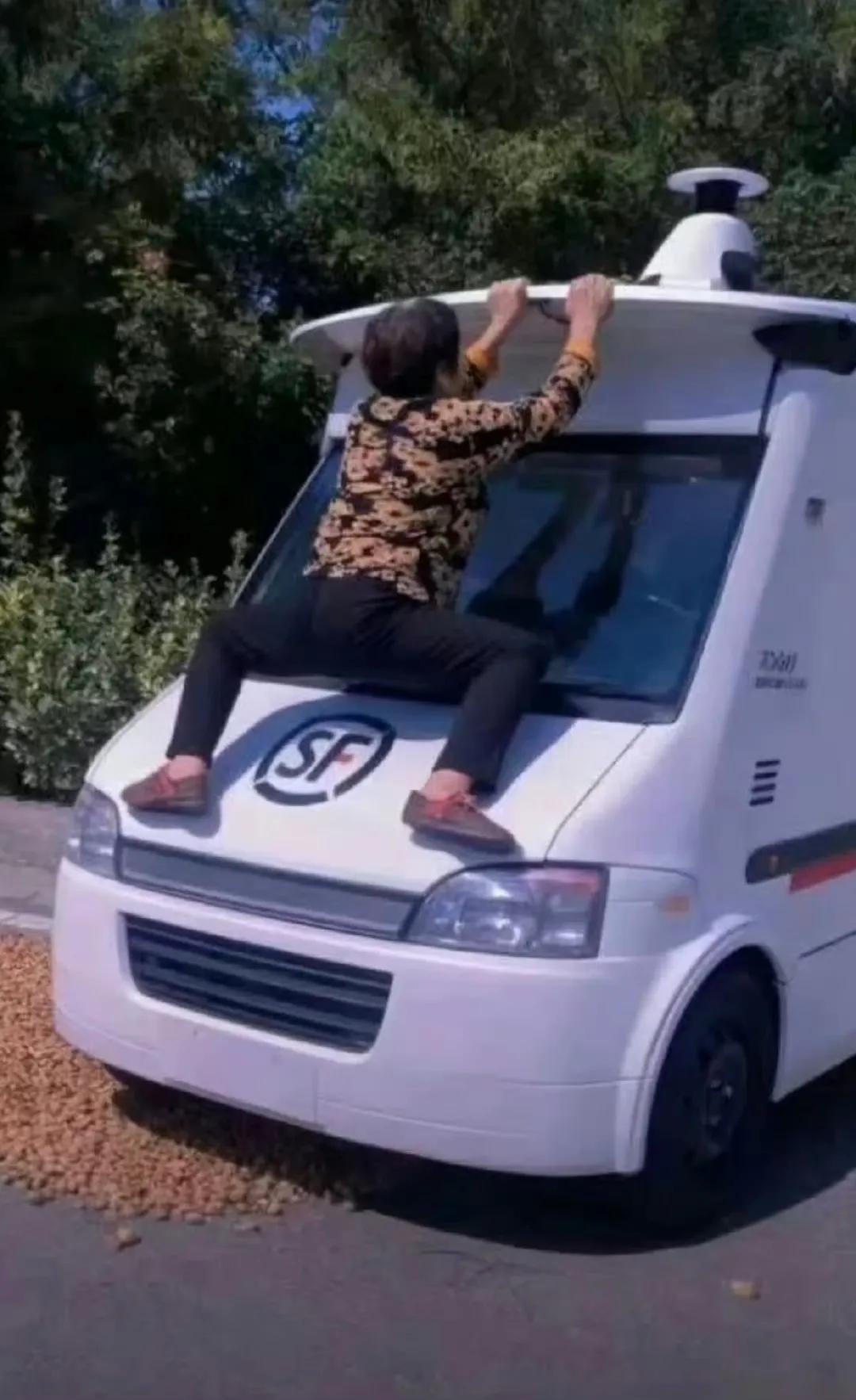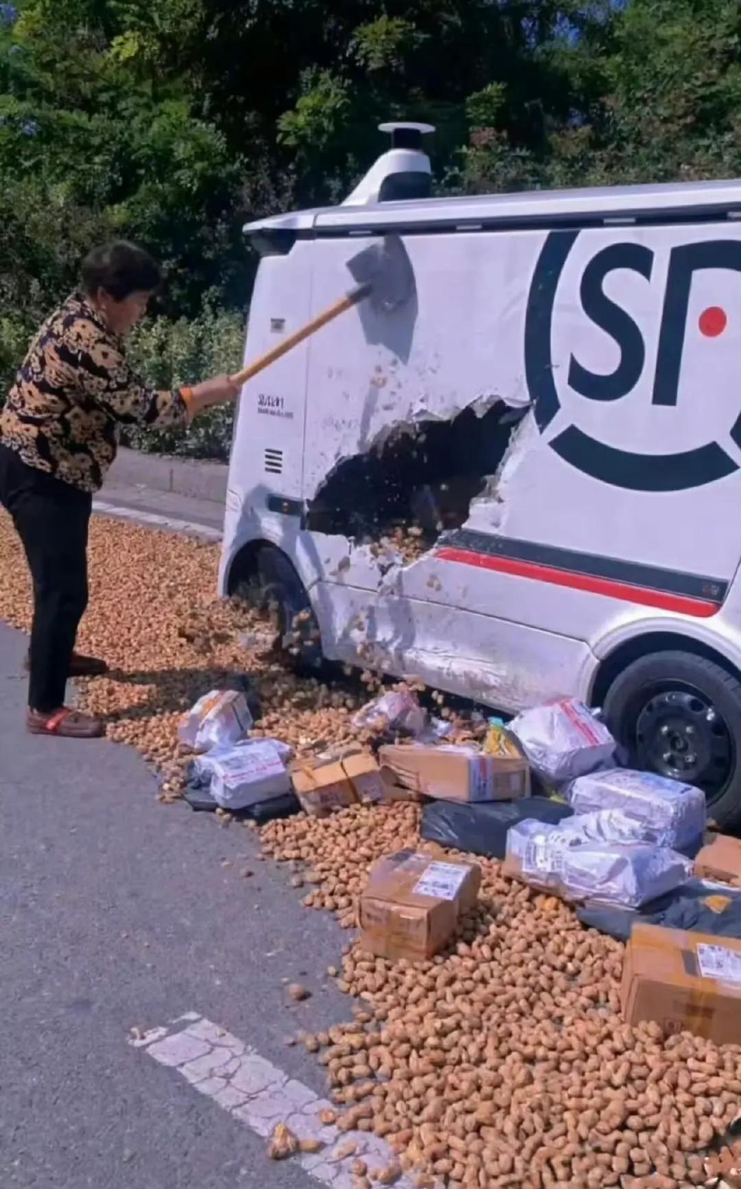 大妈晒在路边的花生, 被无人驾驶快递车给压了, 一气之下竟然把车砸了。