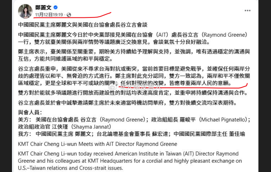 近期看到的三次人物专访,都有遗憾一是凤凰网在11月5日发布的采访馆长陈之汉,二是王伟忠11月19日采访郑丽文,三是黄光芹采访萧旭岑,当然要感谢这三位采访者,通过他们的采访,观众可以了解到馆长、郑丽文、萧旭岑的真实想法。但我感觉遗憾地是,就是三位采访者,没有逼问出被采访人的进一步真实想法。 国防部喊话做堂堂正正的中国人 1. 凤凰网采访馆长时,馆长声称两岸“不能打、不能打、还是不能打”(图1),要求大陆给湾湾一些时间,凤凰网的采访者没有进一步问馆长,大陆一再称武统只针对抬毒顽固粪子,你支持打击抬毒顽固粪子吗?凤凰网没有问,观众错过了知道馆长是否呵护顽固粪子的机会。2. 王伟忠采访郑丽文时,问郑会不会在促进统一方面做努力呢,郑乱扯务实、目前是两岸和平、统一是终局安排,王被郑的瞎扯就绕过去了,没有进一步逼问,如果大陆不允许你郑丽文“只谈和平、不谈统一”呢,没有逼问郑大陆打击抬毒你支持吗,你说过你们蓝营也反抬毒呀。王没有问出郑进一步的观点,唉3. 黄光芹采访萧旭岑,萧替郑的脸书内容辩护,郑的脸书上写过,“任何对现状的改变,皆应尊重两岸人民的意愿”(图3),黄身为资深老蓝女、独台粪子,强调湾湾未来只能由2300万人决定,但郑的这句话,在黄看来湾湾未来怎么能让大陆人的意见也参与进来呢,结果萧东说西说,也绕过去了,黄也没有进一步逼问。。。热点观点 ,国台办批赖清德的分裂谬论,高市再发涉台谬论 ,