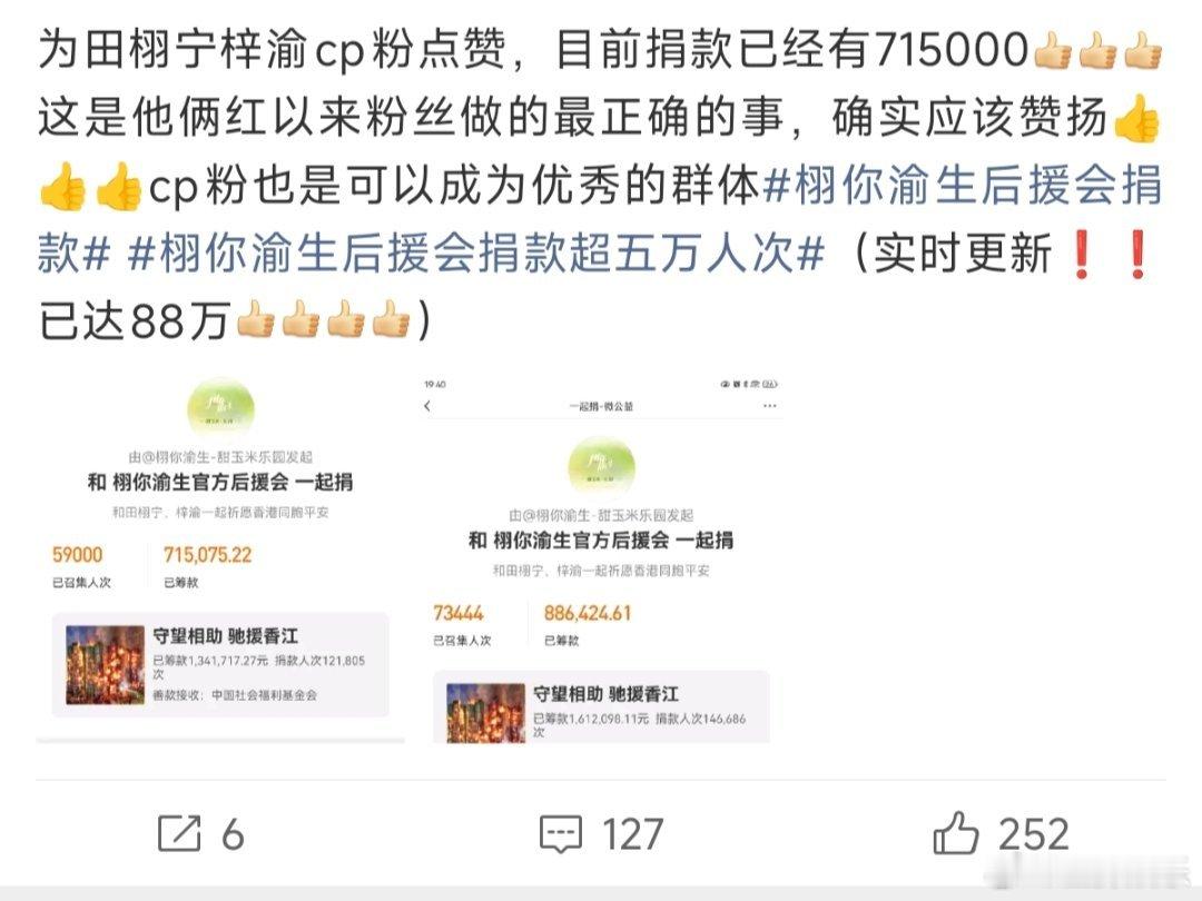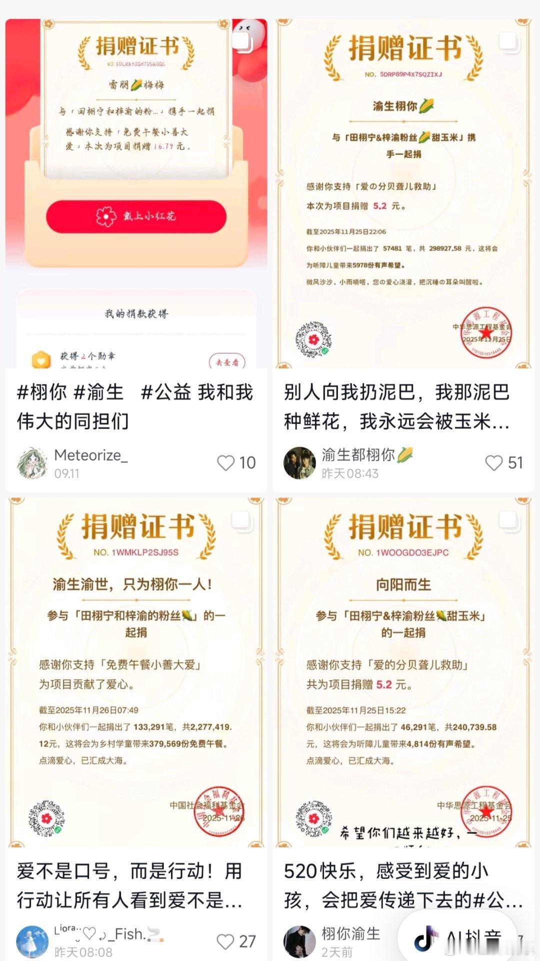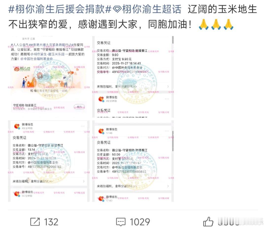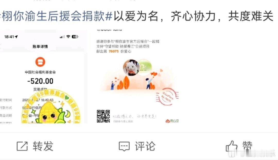 栩你渝生后援会捐款看到栩你渝生后援会的成员们这么有爱心,并不感到新奇,因为辽阔的玉米地生不出狭隘的爱。两位优秀正直的正主吸引来的也会是,善良有爱心的粉丝。有你们在,他们两个都会越来越好的