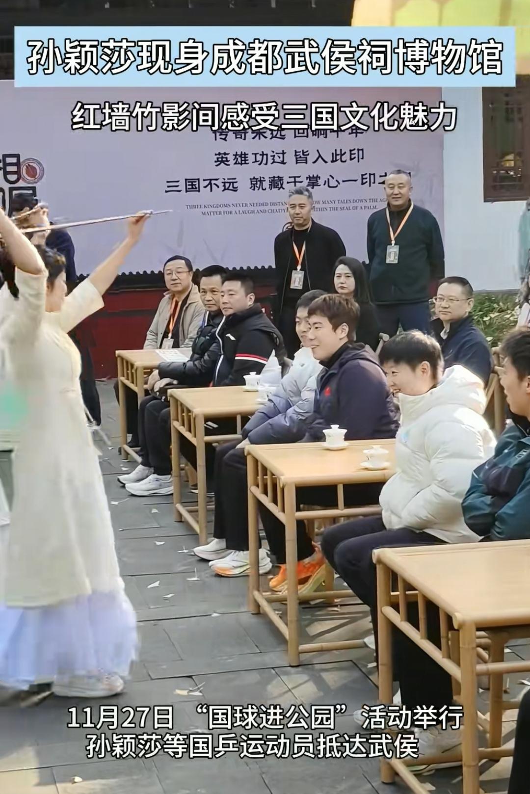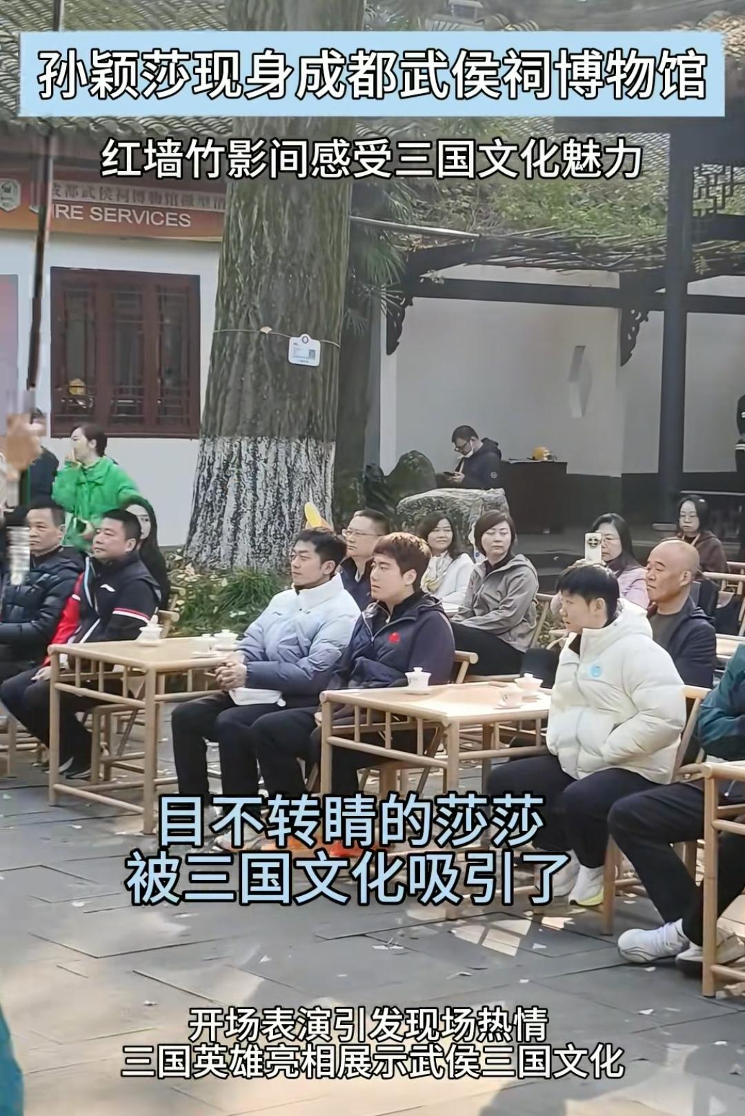 今年是第三届成都混合团体世界杯,虽然莎莎每一届都有参加成都混合团体世界杯,但是却没有时间去成都的著名景点武侯祠游玩。 今天因为国球进校园的相关活动,国乒队员才有机会到武侯祠游玩一趟的机会。 莎莎坐在那里看表演的时候,眼神非常的专注,聪明的孩子就是一个好奇宝宝,莎莎虽然已经满二十五岁了,但是真的完全看不出年龄在她脸上留下痕迹。 内心简单纯粹的人,眼神也特别的清澈,笑容也格外的可爱,她的心思只用在赛场上,赛场下的莎莎就是一个简单可爱的小女孩。