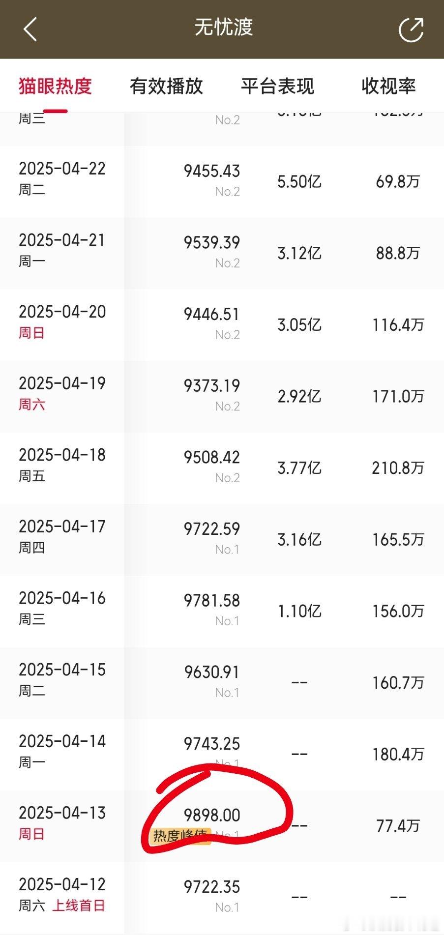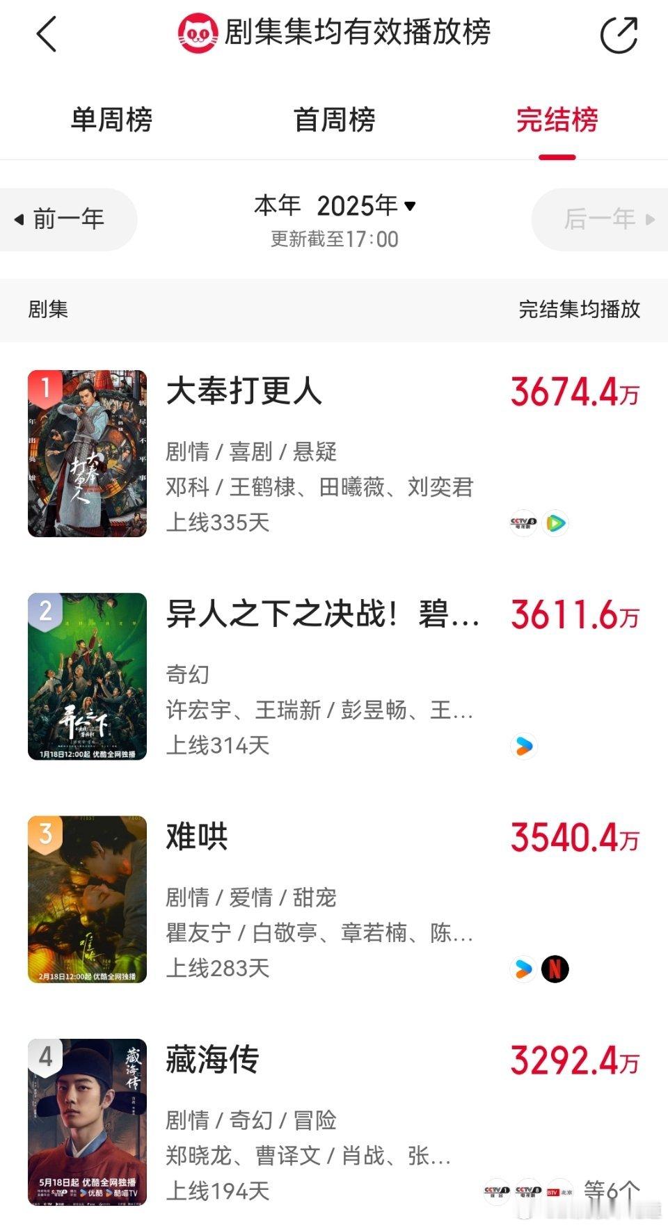 无聊,翻看猫眼记录的各部剧集各项数据,发现几个有意思的点:原来2025年剧集猫眼集均有效播放量全平台最高的是异人之下之决战碧游村。而猫眼热度峰值全平台最高的是无忧渡9898另外,猫眼集均有效播放年榜其实并非累计数据,而是开播当月的月榜数据,那么这个年榜数据就会存在有的剧月初开播计算集数天数二三十天有的剧月末开播计算集数天数可能只有几天(也有月末开播算到下个月月榜中,则计算天数为整月数据),总之挺混乱的。