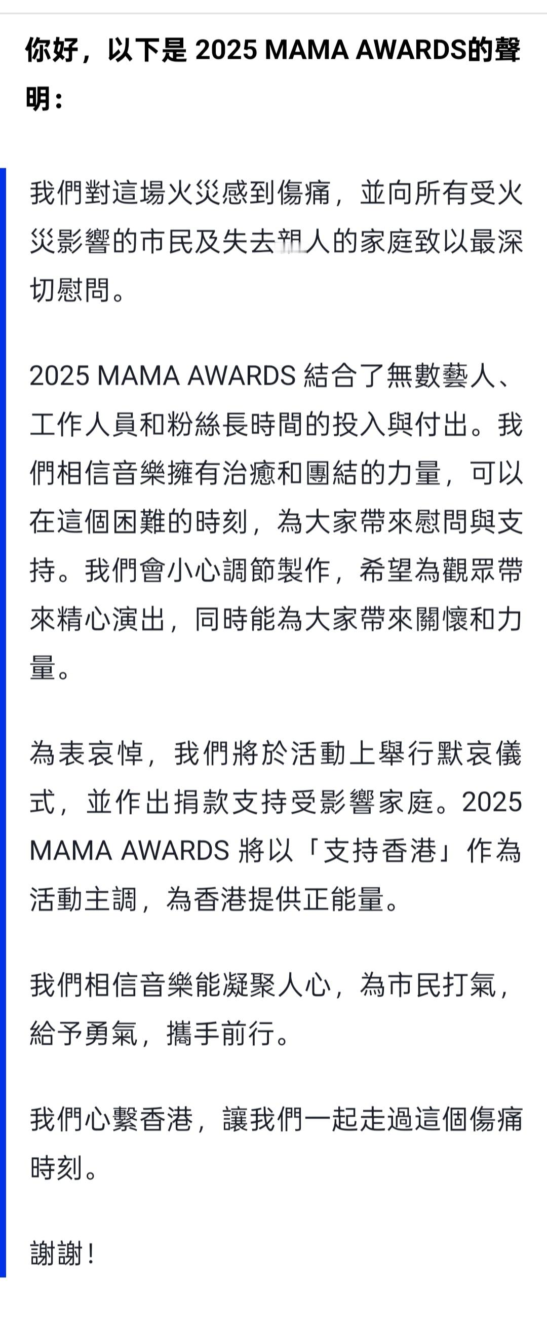 MAMA主办方发布公告,确认明后两天在香港的活动如期举行:“我们相信音乐拥有治愈和团结的力量,可以在这个困难的时刻,为大家带来慰问与支持。。为表哀悼,我们将于活动上举行默哀仪式,并作出捐款支持受影响家庭。2025MAMA将以「支持香港」作为活动主调,为香港提供正能量。我们相信音乐能凝聚人心,为市民打气,给予勇气,携手前行。我们心系香港,让我们一起走过这个伤痛时刻。”