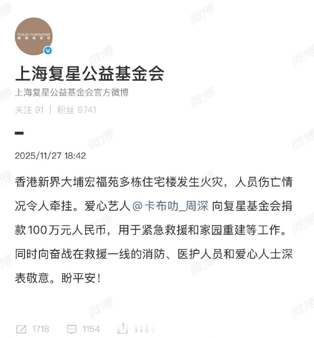 周深向香港捐款100万元香港新界大埔宏福苑多栋住宅楼发生火灾,人员伤亡情况令人牵