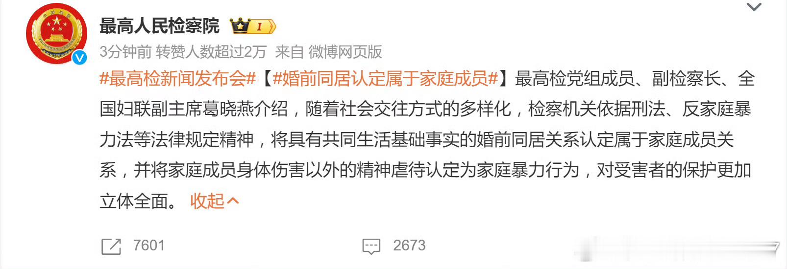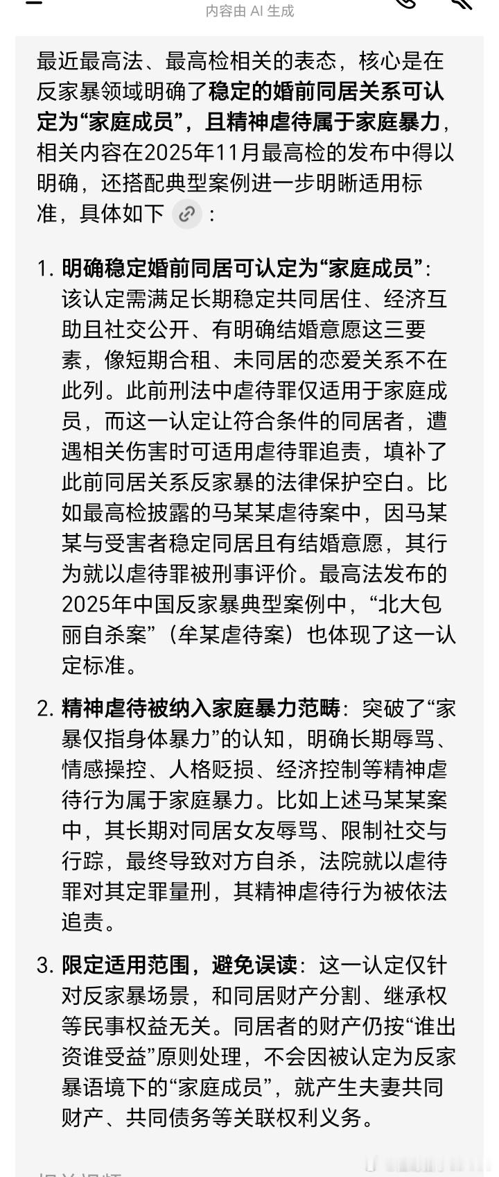 桂哥评:最近有关这个,用AI大模型搜了一下。小伙伴们还是要了解一下法律,学习一下法律,了解清楚法律。避免误读了。===最近最高法、最高检相关的表态,核心是在反家暴领域明确了稳定的婚前同居关系可认定为“家庭成员”,且精神虐待属于家庭暴力,相关内容在2025年11月最高检的发布中得以明确,还搭配典型案例进一步明晰适用标准,具体如下 :1. 明确稳定婚前同居可认定为“家庭成员”:该认定需满足长期稳定共同居住、经济互助且社交公开、有明确结婚意愿这三要素,像短期合租、未同居的恋爱关系不在此列。此前刑法中虐待罪仅适用于家庭成员,而这一认定让符合条件的同居者,遭遇相关伤害时可适用虐待罪追责,填补了此前同居关系反家暴的法律保护空白。比如最高检披露的马某某虐待案中,因马某某与受害者稳定同居且有结婚意愿,其行为就以虐待罪被刑事评价。最高法发布的2025年中国反家暴典型案例中,“北大包丽自杀案”(牟某虐待案)也体现了这一认定标准。2. 精神虐待被纳入家庭暴力范畴:突破了“家暴仅指身体暴力”的认知,明确长期辱骂、情感操控、人格贬损、经济控制等精神虐待行为属于家庭暴力。比如上述马某某案中,其长期对同居女友辱骂、限制社交与行踪,最终导致对方自杀,法院就以虐待罪对其定罪量刑,其精神虐待行为被依法追责。3. 限定适用范围,避免误读:这一认定仅针对反家暴场景,和同居财产分割、继承权等民事权益无关。同居者的财产仍按“谁出资谁受益”原则处理,不会因被认定为反家暴语境下的“家庭成员”,就产生夫妻共同财产、共同债务等关联权利义务。(AI大模型总结)