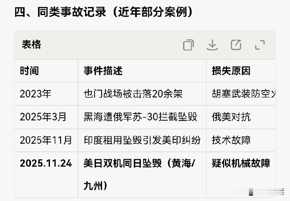 2025年11月24日这一天,美日在中国周边海域的无人机事故引发热议。日本海上保安厅的“海上卫士”无人机在北九州机场着陆时螺旋桨等部位受损,被认定为“重大事故”。而驻韩美军的MQ - 9“死神”无人机在韩国群山附近海域坠毁,这架无人机造价3000万美元,美军原本想用它盯防朝鲜。 从高调入驻韩国到坠毁还不到三个月,MQ - 9“死神”有多次被击落记录,胡塞武装至少5次宣布击落它。这次坠毁原因不明,若因电子信号干扰,对美军来说麻烦可就大了。毕竟美国空军还有200多架MQ - 9,要是真有电子攻击隐患,那可真是“死神”末日了。 这事竟然没有热搜!美军无人机事故