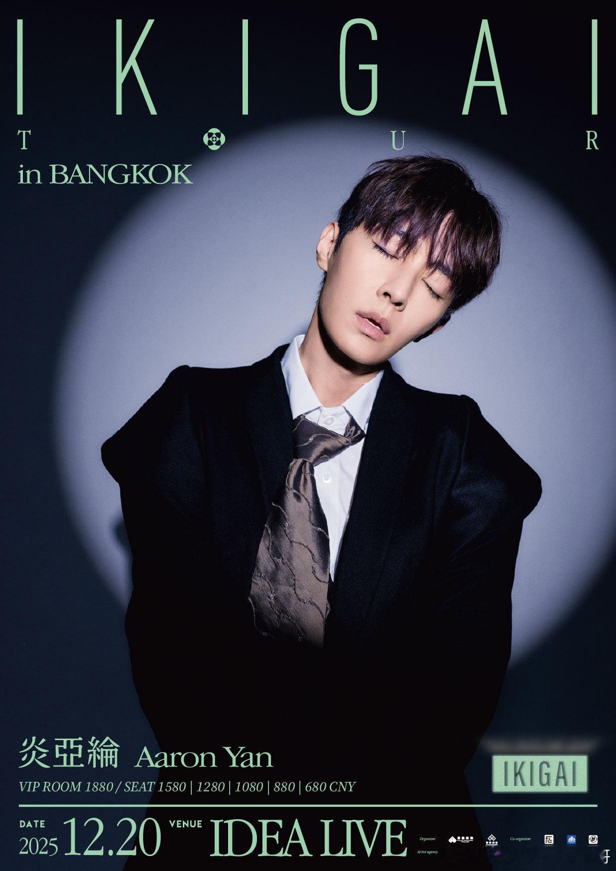 炎亚纶泰国演唱会官宣 炎亚纶歌迷有福啦!不仅筹备三年的第七张专辑《Ikigai》官宣,海外巡演首站也同步定档12月20日,落地泰国曼谷!从《纪念日》听到《寂寞暴走》,每一首都是在耳机里循环过无数次的歌曲。这次更是刚发完新专《Ikigai》就火速开唱, 陈珊妮制作 × 葛大为全词作加持, 泰国场新歌首唱舞台含金量直接拉满有没有!