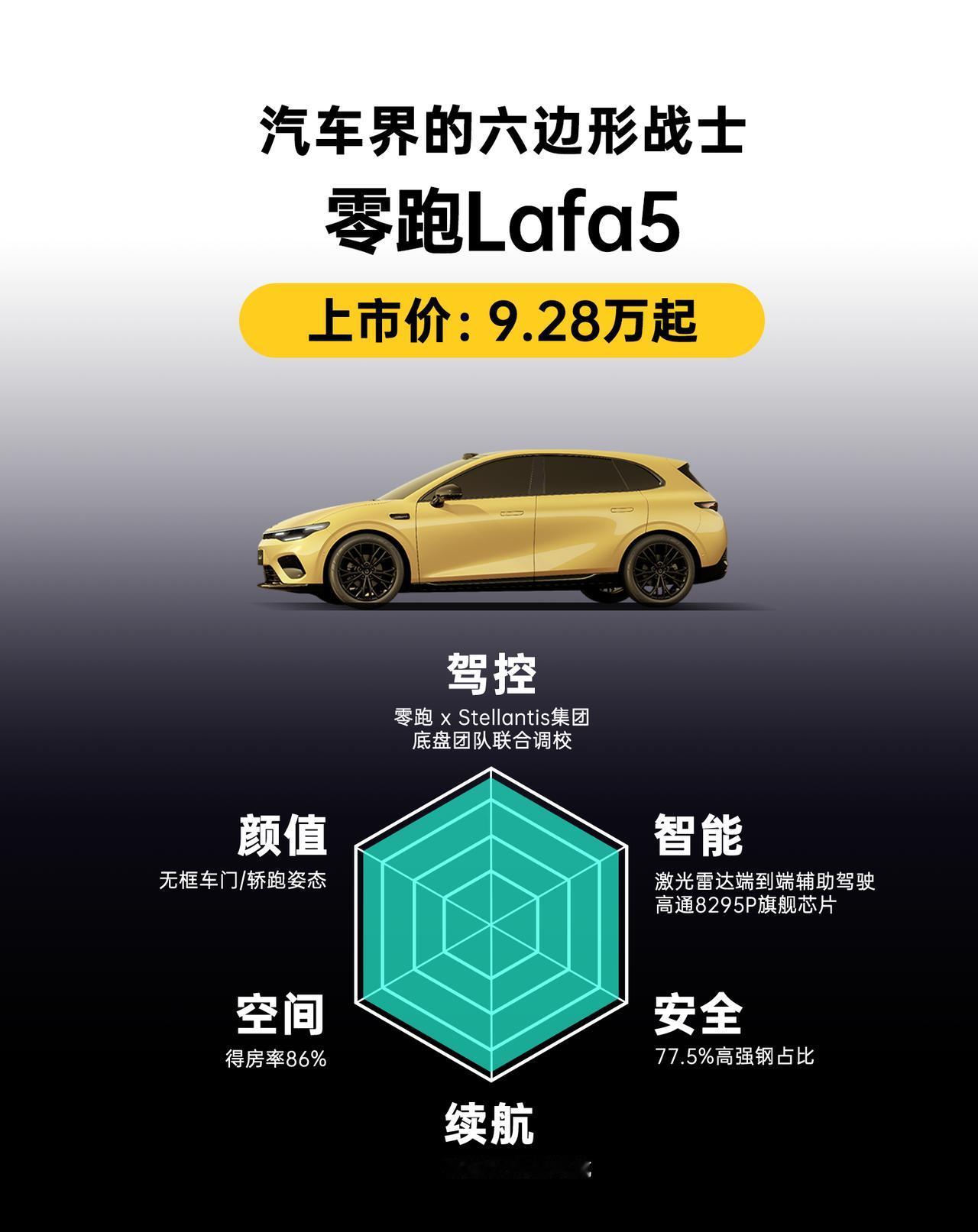 哇塞,零跑还真会搞事情,终于推出了它的运动担当车型Lafa5,说实话,这款车让人一眼就会爱上。 感觉15万之内能拿到这样的车子,简直就是降维打击了,每一个细节都做得很到位,太戳人的心,多个不同颜色可选,宽体轿跑的设计,坐进去会秒变霸总。 8295+8650的旗舰芯片,另外还有全域的激光雷达以及后置后驱,甚至还有斯特兰蒂斯集团联合调教的底盘,就这样的车子,走山路那都是稳稳的,很多人都说这款车子是对标高尔夫GTI的车型,感觉说的还真是太对了。 已经被实力圈粉,必须要拿下。