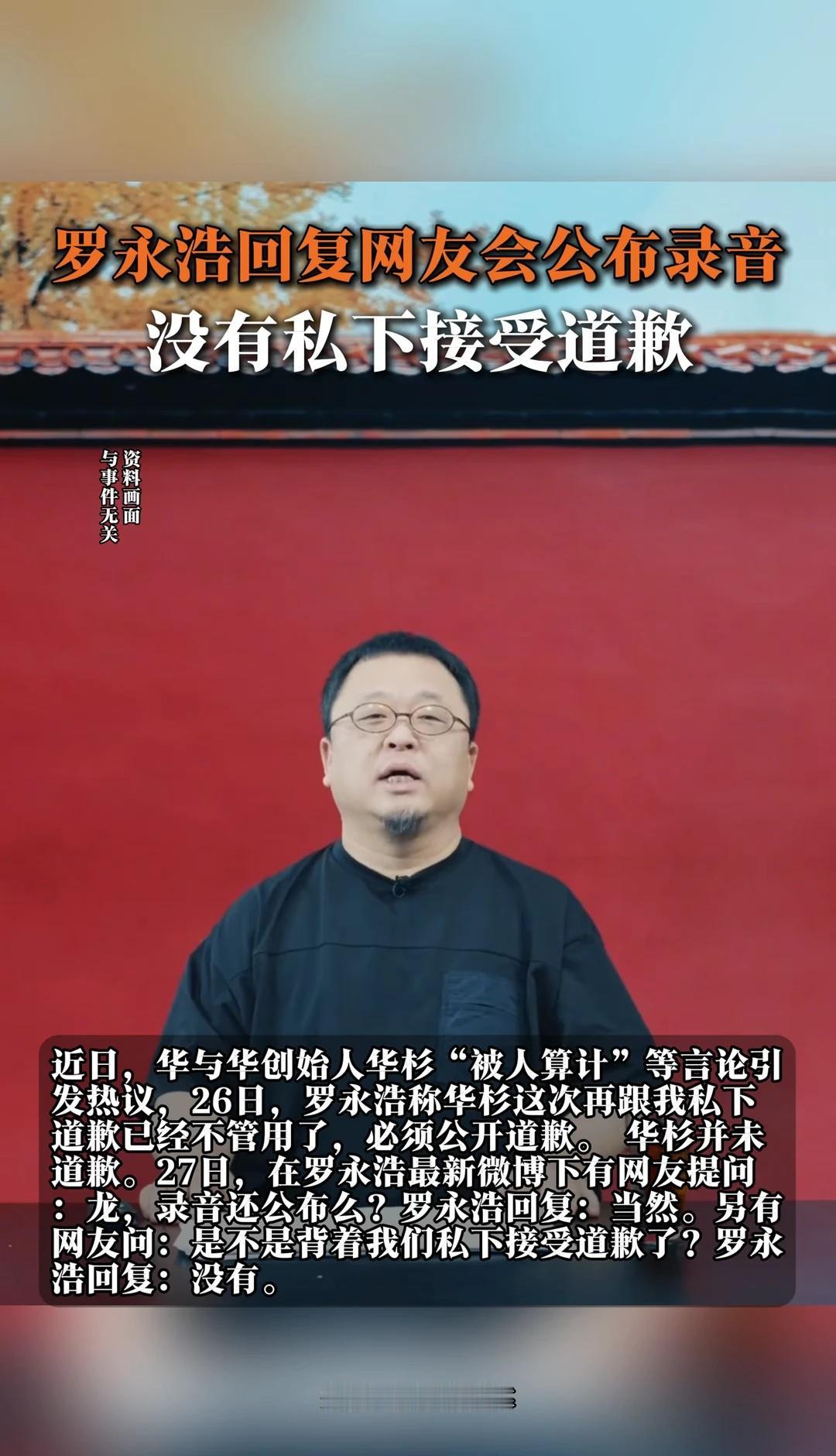 近日,华与华创始人华杉“被人算计”等言论引发热议,26日,罗永浩称华杉这次再跟我私下道歉已经不管用了,必须公开道歉。 华杉并未道歉。27日,在罗永浩最新微博下有网友提问:龙,录音还公布么?罗永浩回复:当然。另有网友问:是不是背着我们私下接受道歉了?罗永浩回复:没有。