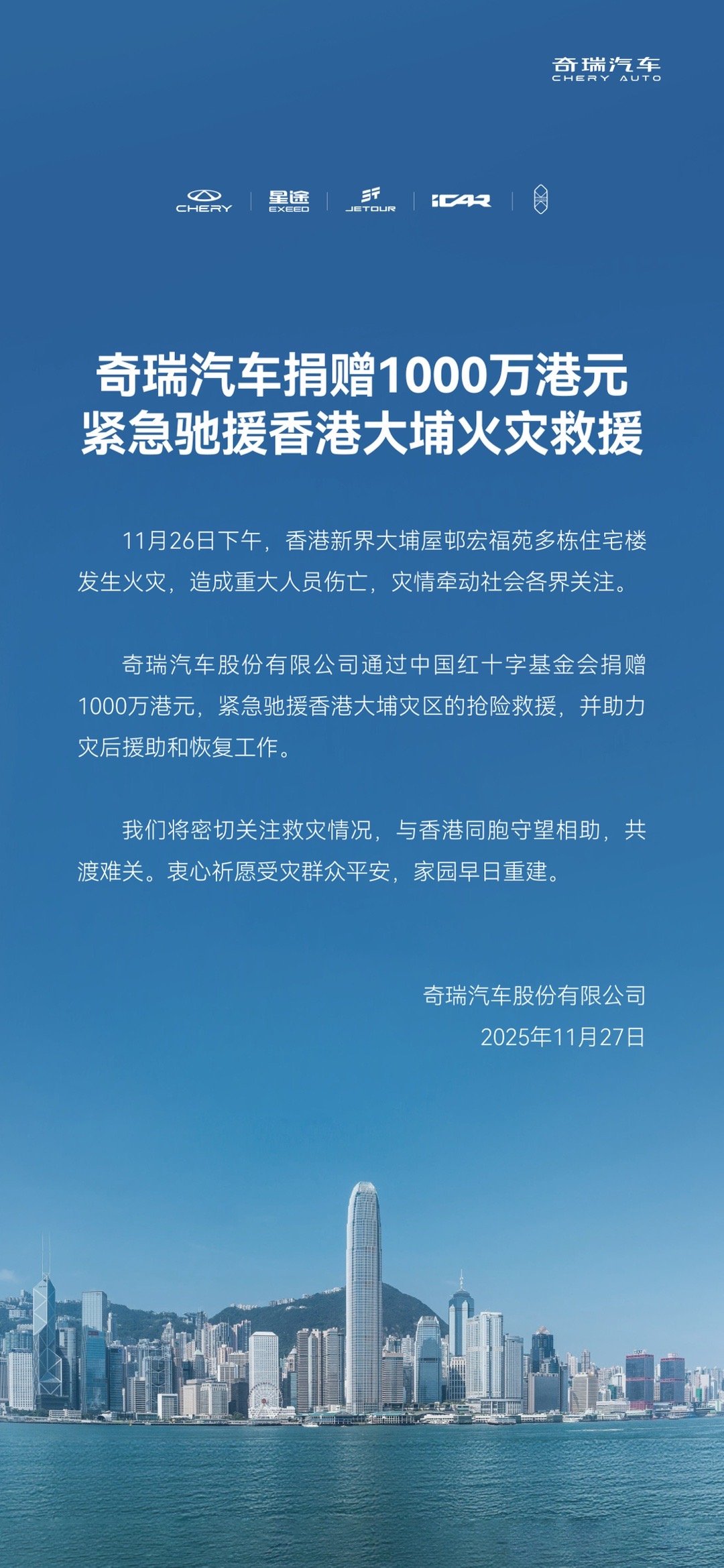 奇瑞汽车捐赠1000万港元,给奇瑞点赞!香港向每户灾民发1万港元补助