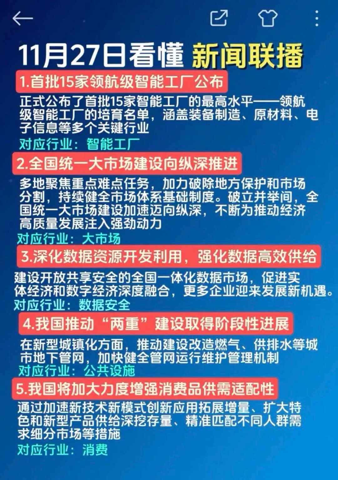 11.27周四 新闻联播里投资机会!1.智能工厂2.统一大市场3.数据安全4.公共设施(燃气,供排水)5.大消费、