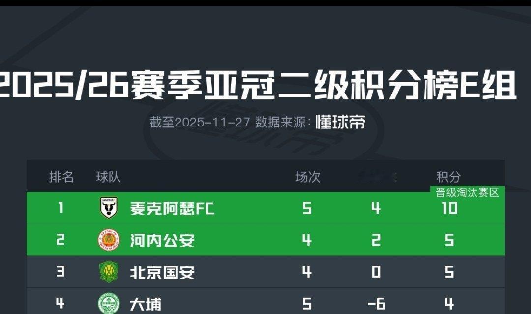麦克阿瑟FC战胜大埔,国安与河内公安的胜者将直接晋级淘汰赛足球亚冠 北京时间11月27日,亚冠二级联赛小组赛第5轮,麦克阿瑟FC主场2-1战胜大埔。接下来北京国安与河内公安之间的胜者将直接晋级淘汰赛。麦克阿瑟FC此役获胜后积10分,而小组排名二三位的河内公安和北京国安同积5分,大埔五轮过后积4分垫底。根据亚冠二级联赛规则,若出现分数相同的球队,优先比较相互对阵积分。河内公安和北京国安在小组赛首场较量中2-2战平,若今晚国安获胜,将凭借胜负关系优势提前1轮锁定淘汰赛资格,输球将被淘汰。