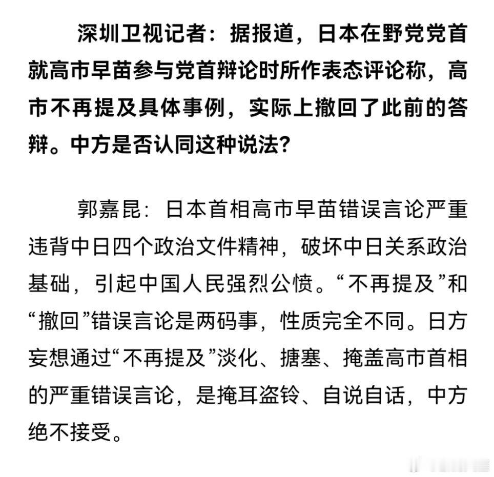高市明显的已经软化了,表示今后“不再提及”。但面对这样的表态,我们不认可。中方