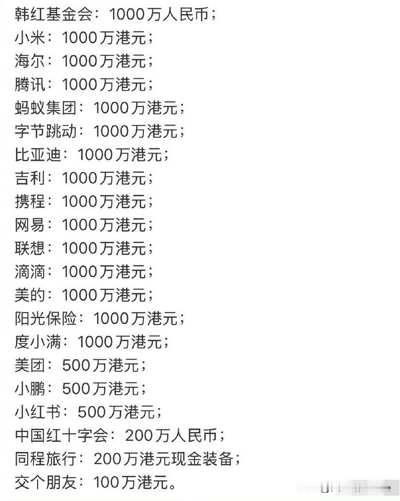 香港大埔宏福苑火灾后,众多艺人及相关团体纷纷捐款助力救灾。 现在主要是企业以及相关的团体捐款,后续明星也会开始吧,一笔笔救灾捐款及时送达,一张张转账截图传递力量。 长长的捐赠名单里,藏着无数份牵挂;点滴善意汇聚成河,化作照亮香江的暖流,也让“一方有难,八方支援”的温暖,在这一刻愈发真切动人。