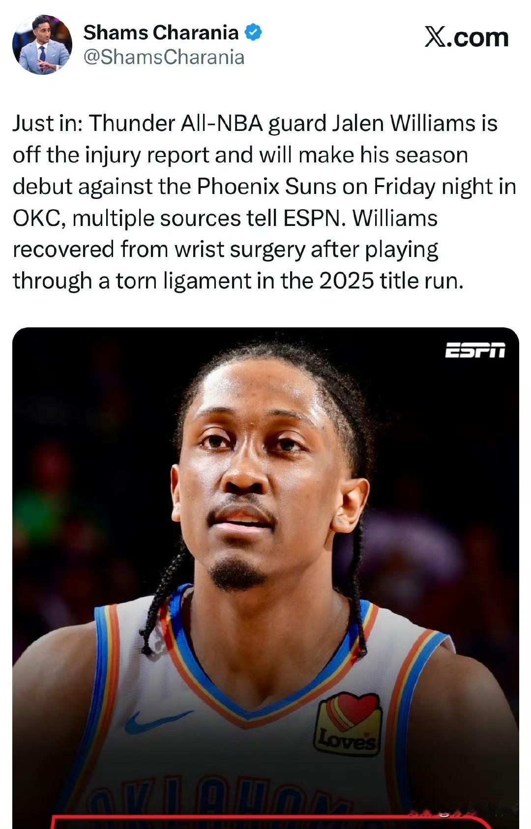 上演赛季首秀!!!杰伦-威廉姆斯将在本周六对阵太阳的比赛中复出! 根据记者Shams最新消息透露,雷霆前锋杰伦-威廉姆斯将于明天复出,本场比赛是雷霆主场迎战太阳的比赛,杰伦威将上演新赛季首秀! 杰伦-威廉姆斯夏天来中国行的时候就还有伤在身,没有完全康复,他也是一直缺阵到了现在,不过雷霆仍拿到了18胜1负的战绩,主要是他们的板凳深度太强大了。 杰伦威回归让雷霆增加了一个核心进攻点,亚历山大是不是更可以轻松三节打卡了。 雷霆今年还是卫冕冠军,他们本赛季拿下MVP和总决赛冠军的概率还是很高,只要他们没有大面积的伤病,雷霆还是目前联盟中整体实力最强的球队。 恭喜杰伦-威廉姆斯回归,明天早上十点半,一起关注比赛,期待他的表现! 雷霆 雷霆队 雷霆阵容