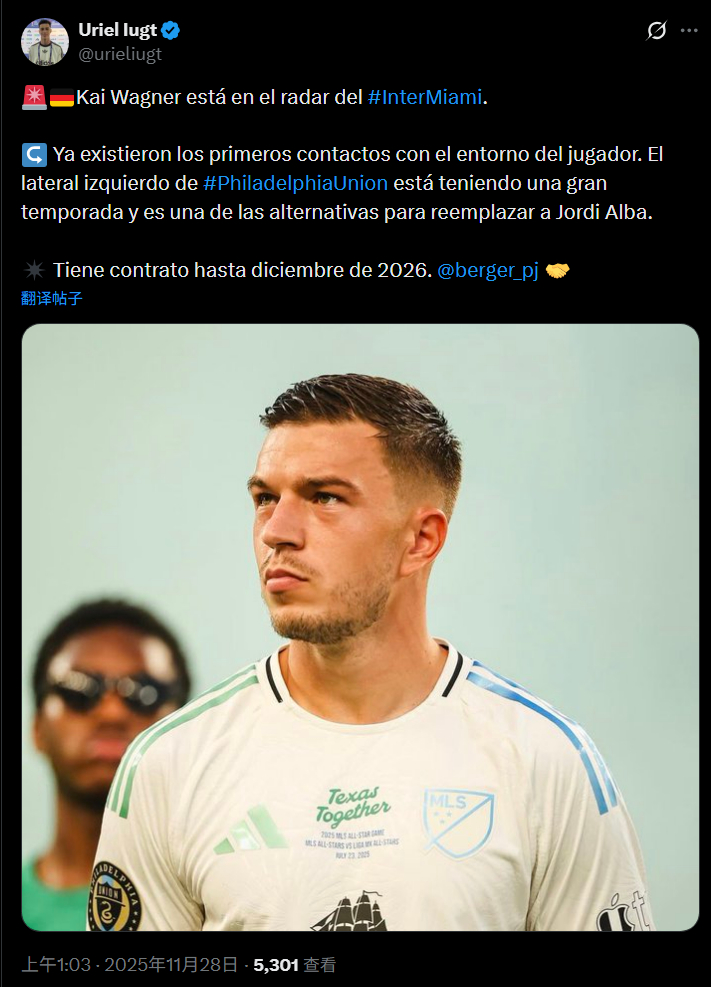 🔁迈阿密转会传闻:阿尔巴的替代者?据记者乌列尔·伊乌特消息,费城联合队的左边后卫凯·瓦格纳进入迈阿密国际的引援视野,俱乐部已经与球员的团队进行了初步接触。本赛季这名德国球员表现非常出色,入选了美职联常规赛最佳阵容。迈阿密国际