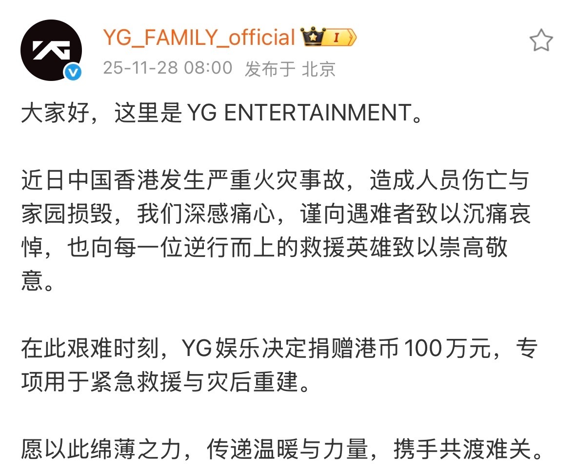 YG为香港火灾捐款100万港元
