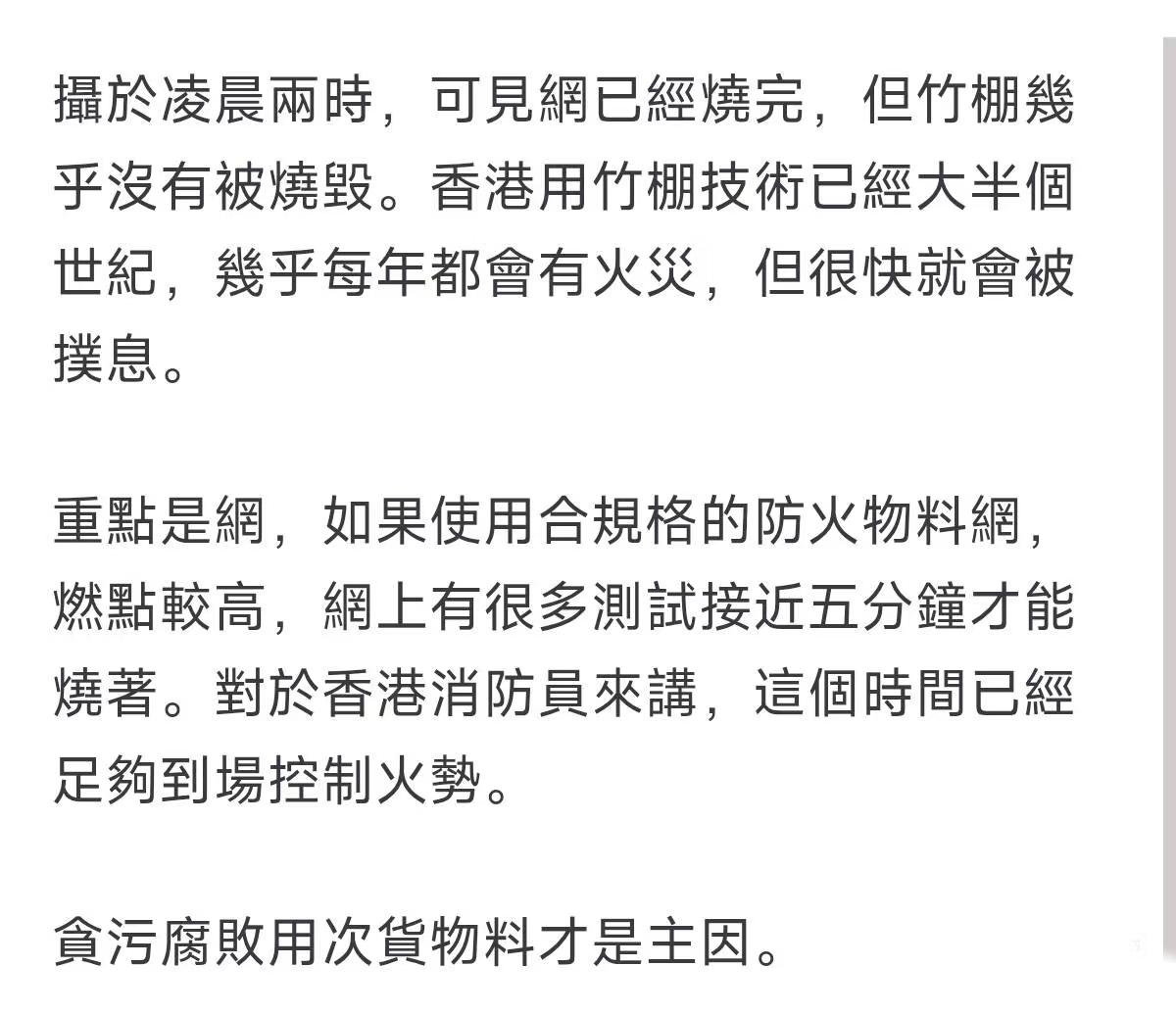 香港竹棚支持者给出了不用铁架的原因,我给总结下就是: 1、香港用竹棚历史悠久,已经有大半个实际。 2、几乎每年都有类似火灾,但很快会扑灭。 3、他认为这次火灾主要是网,竹棚并没有被完全烧毁,并质疑网的质量。 总的意思是祖宗之法不可变,很不明白,香港这么现代化的城市,竟然也有这么落后的一面。