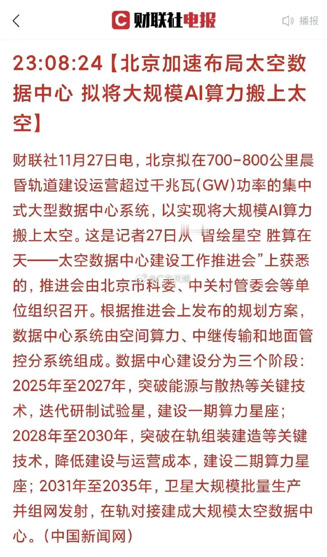 深夜重磅消息利好这一板块!财联社11月27日发布的信息:北京拟在700-800公里晨昏轨道建设超千兆瓦功率的太空数据中心,目标将大规模AI算力部署至太空,分三阶段推进(2025-2027年突破能源/散热技术、2028-2030年突破在轨组装、2031-2035年大规模组网),系统包含空间算力、中继传输、地面管控模块,由北京市科委等单位牵头,是继“东数西算”后的国家级算力新战略。受益概念股梳理1. 顺灏股份:以1.1亿元投资北京轨道辰光(太空数据中心建设运营商),持股19.3%成第二大股东,后者首颗25P算力试验星“辰光一号”将在2025年底/2026年初发射,是项目直接受益标的。2. 普天科技:深度参与“三体计算星座”,负责星间/星地链路、卫星载荷、地面站建设,是太空在轨AI计算核心供应商,2025年机构预测净利增幅超900%,订单按星座规模签订。3. 北京君正:为低轨卫星提供抗辐射芯片,是三体计算星座核心芯片商,突破美国技术垄断实现国产化,保障星载AI计算稳定,卫星放量将带动其业绩高增长。4. 寒武纪:思元系列AI芯片用于“星算计划”,单颗算力达744TOPS,使卫星从“数据快递员”升级为“太空分析师”,数据处理周期从月/周级缩至秒级,芯片植入每颗卫星量价齐升。5. 复旦微电:国内唯一量产抗辐射FPGA的企业,产品用于“三体计算星座”核心控制模块,通过航天级认证,是卫星控制系统核心供应商,技术壁垒高、毛利率超60%。6. 中国卫星:A股卫星全产业链龙头,承担“三体计算星座”卫星制造与组网,新一代卫星算力提10倍、能耗降50%,2025年相关订单预计增长200%。7. 航天电子:星载计算机市占率超90%,提供卫星电源管理、姿态控制、激光通信设备等,为太空数据中心定制高可靠电子方案,是多个商业航天项目核心供应商。8. 开普云:与国星宇航签“星算计划”战略合作,研发搭载开悟大模型的AI卫星,建地面算力中心支撑卫星数据处理,实现天地算力无缝协同。9. 中科星图:空天信息服务商,为太空数据中心提供地理信息处理,与中科曙光共建普惠太空算网,“星图地球”可24小时内推送卫星信息,是商业化应用关键方。10. 乾照光电:砷化镓太阳能电池转换效率超30%,为太空数据中心提供能源支持,产品应用于多个商业卫星星座,是太空能源系统核心配套商,单项目毛利率超40%。11. 英维克:将地面液冷技术延伸至太空散热,攻克卫星散热难题,获NASA合作项目,2025年斩获英伟达液冷机柜订单,为算力卫星设备提供高效散热方案。12. 中国卫通:运营“中星”高通量卫星,与太空算力星座形成星间链路协同,提供星地传输通信支撑,未来有望扮演“太空云服务商”拓展算力租赁业务。13. 光迅科技:全球唯二量产100Gbps星间激光通信模块的企业,为“三体星座”提供高速互联设备,通信速率较传统方案提10倍,是太空算力网络的高速链路支撑商。14. 中科曙光:与中科星图共建“天地一体化”算网,提供抗辐射加固型服务器,实现“用户-星上-天基-地基”四级算力调度,接入国家级算力平台。15. 航天环宇:专注卫星结构与热控系统,产品应用于算力卫星,优化在轨稳定性与极端环境散热效率,是算力卫星核心结构部件供应商,持续扩大市场份额。16. 欧比特:玉龙810芯片算力12TOPS、功耗仅2W,通过航天级测试,应用于航天电子设备,为算力卫星提供低功耗高算力嵌入式芯片,适配太空资源约束场景。17. 臻镭科技:卫星抗辐射芯片核心供应商,商业航天订单覆盖至2026年,技术获军方认证,保障太空电子设备稳定运行,2026-2027年净利增速超40%。18. 上海瀚讯:“千帆星座”“G60星座”通信分系统供应商,承研载荷通信设备,机构预测净利增速超40%,太空星座建设提速将带动其设备订单增长。19. 高澜股份:为“三体计算星座”定制微通道液冷板,散热效率提40%、PUE压至1.1内,满足算力卫星核心部件散热需求,是太空散热细分龙头。20. 软通动力:开发“星链通”天地一体化通信协议,完成算力卫星网络层验证,承担算力调度体系搭建,布局军工、海外高端场景,拓展太空算力商业化边界。总结这些受益股覆盖太空数据中心全产业链,包含卫星制造/运营、星载芯片、通信链路、能源散热、地面管控等核心环节,多为细分领域技术龙头或资源型企业,卡位了星座组网、算力硬件、天地协同等关键节点。当前赛道处于商业化初期,政策与技术突破持续催化,市场空间预计超千亿元,但需注意技术验证周期长、盈利模式待探索等风险,可重点关注核心参与方与高壁垒标的。本文涉及资讯、数据等内容来自网络公共信息,仅供参考,不构成投资建议!