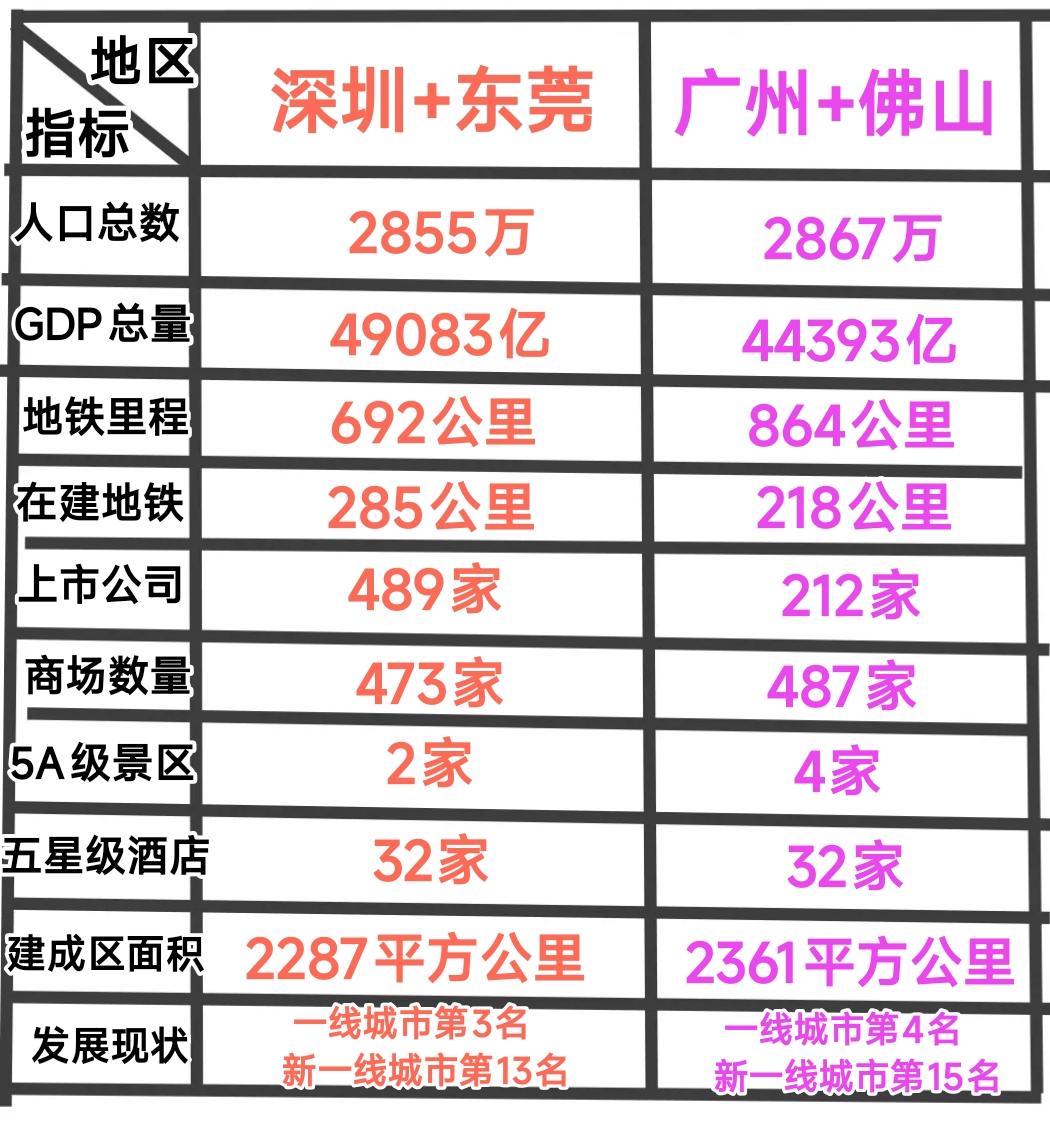 广州+佛山与深圳+东莞,究竟哪组城市的综合实力能略胜一筹呢?经过各项指标的详细对比真的是豁然开朗。 仔细观察广州+佛山的组合在人口总数、地铁里程、旅游资源、市区面积、商业实力略胜一筹。深圳+东莞的组合在上市公司、经济体量这些方面略胜一筹。 这样综合来看广州+佛山的优势是城市基础设施建设更好,深圳+东莞的优势是就业机遇更多一些,仔细想想大概就是这个趋势。