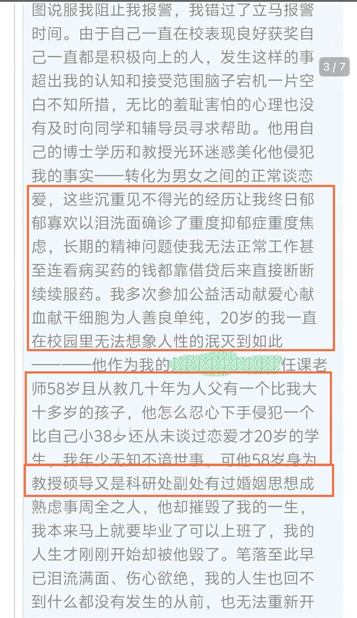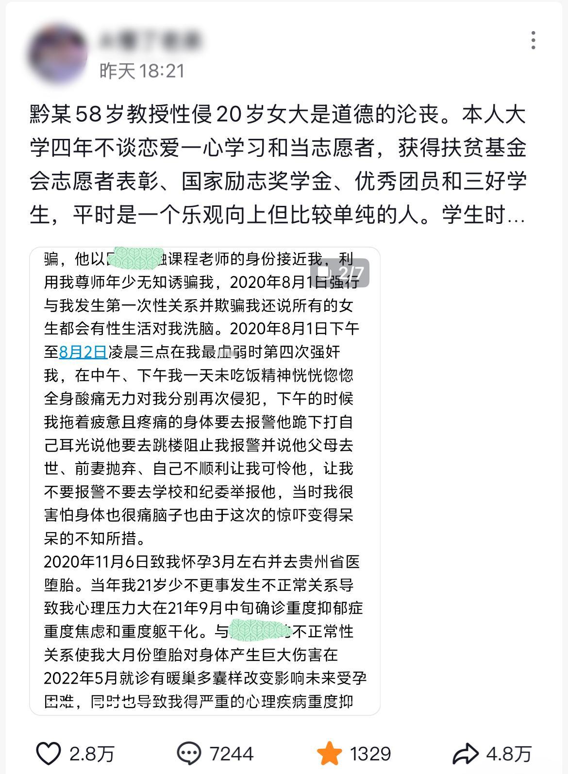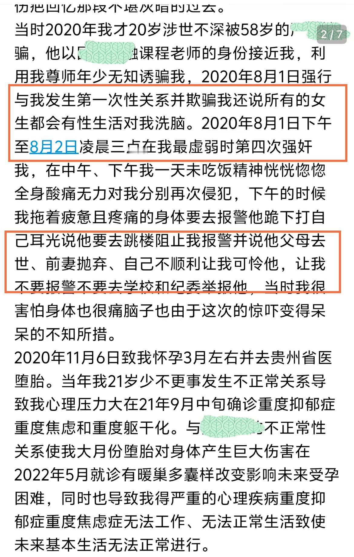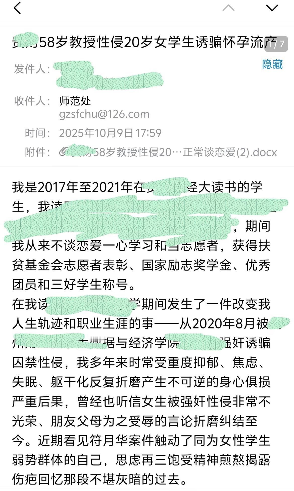 11月27号晚,有多位网友分享了一则邮件,邮件中的内容更是震碎三观,58岁的教授性侵20岁的学生,并导致其怀孕,最后这位20岁的女生患上了抑郁症,且不得不流产。 至于具体的细节,更是炸裂,这位58岁的教授利用自己的身份接近这位女学生,并实施了第一次侵犯,之后连续多次,导致对方怀孕,随即这位女生便想着报警,但却遭到了58岁教授的哄骗,并跪地求饶。 这期间还涉及到转钱,但女方最后退回去了。而且这位女生非常的优秀,获得过国家奖学金,另外还有优秀学生等等。 事情发生差不过五年了,现在才公开,只能说,现在的女生缺乏自我保护能力,缺乏自我维权能力,网络时代,不应该选择这样的沉默,这样的沉默只会让他们更加嚣张,更加肆无忌惮。