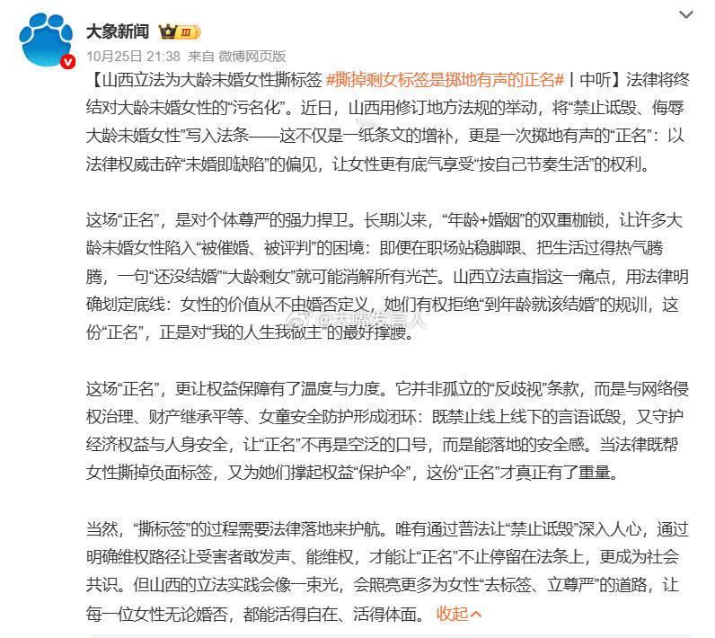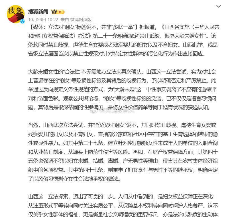 87年大龄剩女感觉嫁不出去焦虑到失眠 我记得有地方曾经立法,不允许诋毁、侮辱大龄未婚女性,媒体、舆论对此一片称好,山西立法对剩女标签说不 那么问题来了,自称剩女,算是“诋毁、侮辱未婚的自己”吗?请问如何对她的违法违规行为,进攻执法?撕掉剩女标签是掷地有声的正名,女性婚姻状态不应成为被评判的标尺,热点观点
