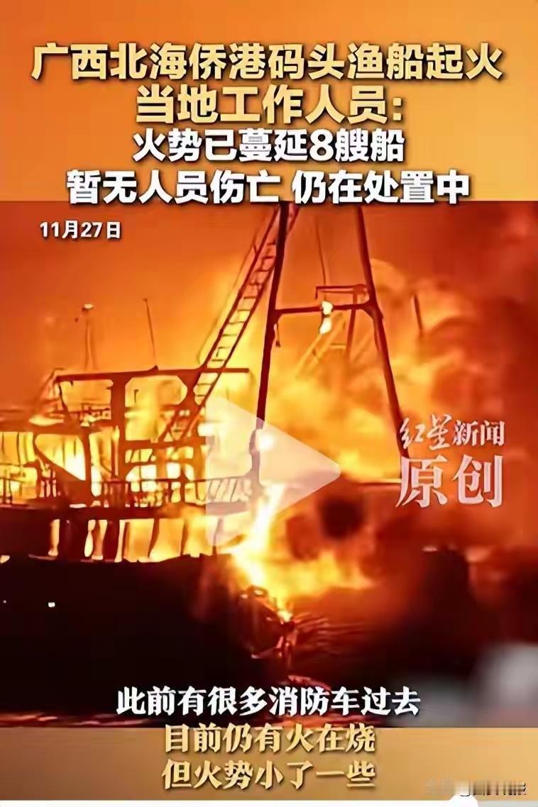 1月27日晚,有网友于社交媒体发文,称广西北海侨港码头有渔船起火。 28日0时左右,红星新闻记者联系到一位目击者。该目击者表示,在自家能看到侨港码头有渔船燃起明火,烟雾较大。此前有消防车前往现场,目前火仍在燃烧,但火势有所减弱。 28日0时10分左右,红星新闻记者联系北海银海区政府办公室,一名工作人员称,目前火势已蔓延至8艘船,尚未扑灭,暂无人员伤亡,消防等部门正在现场处置。