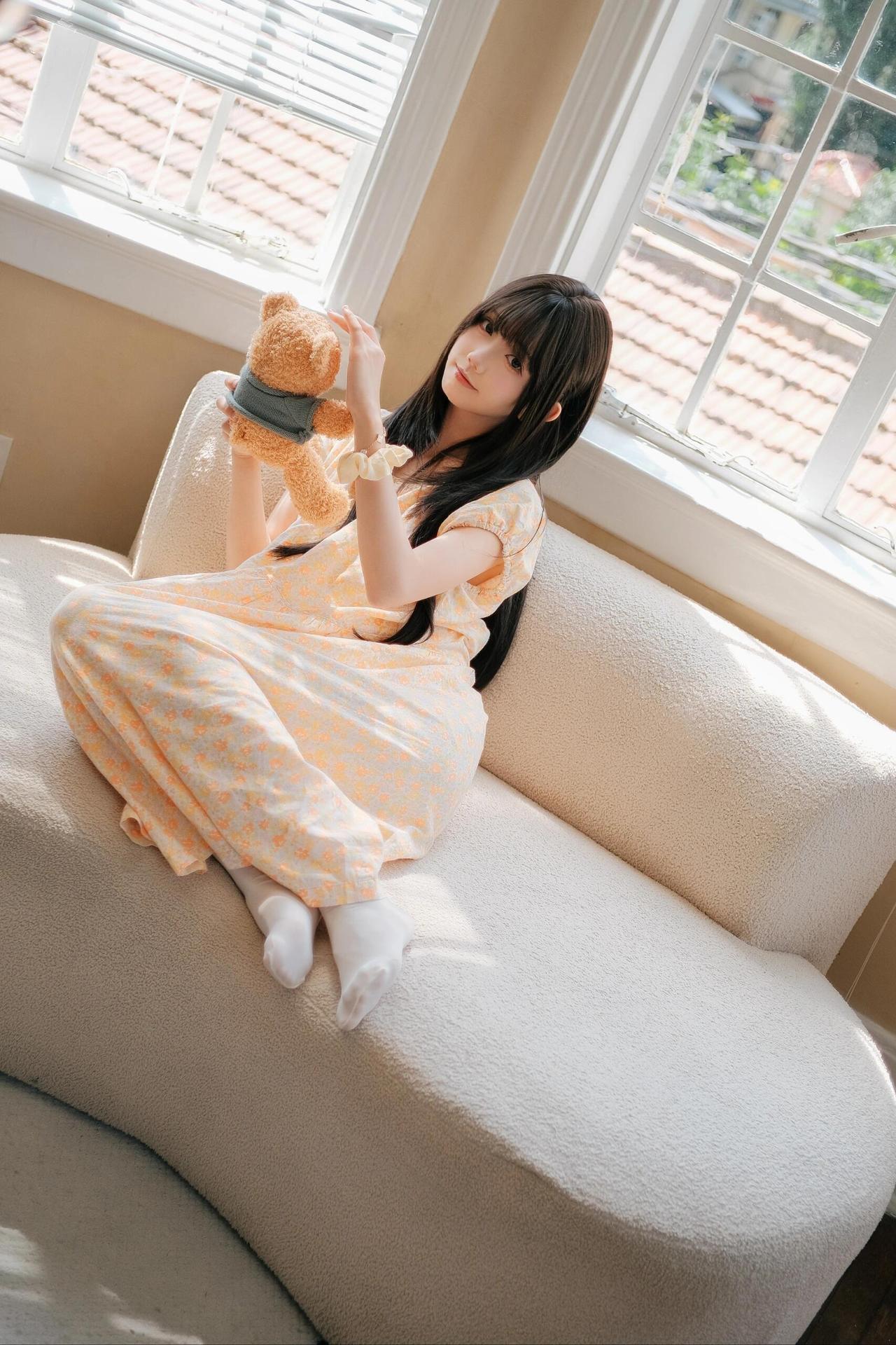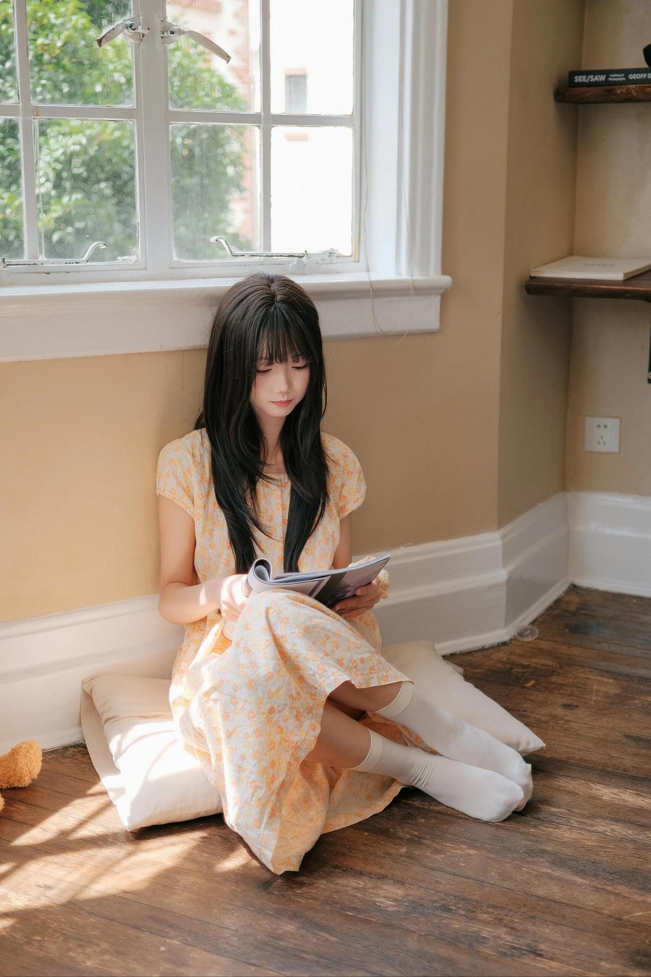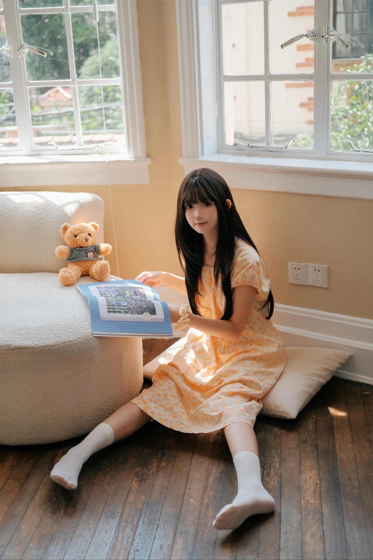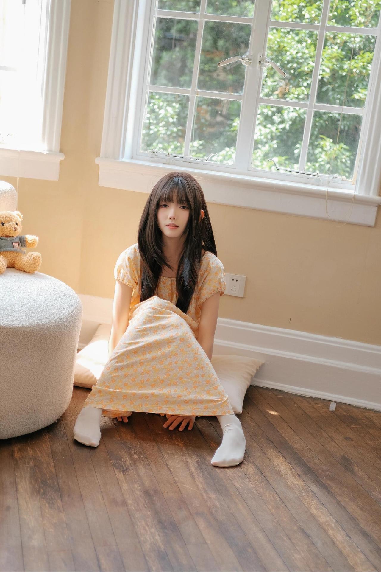 阳光下的甜美少女,微笑着坐在路旁,裙摆随风飘扬。