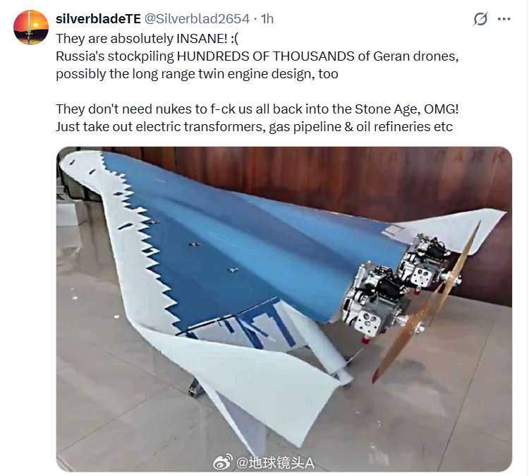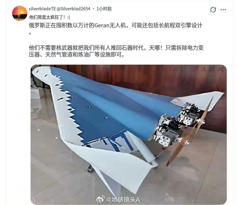 俄某机场中停放的“牵牛星”重型中高空长航时察打一体无人机,三架。今年7月8日测试