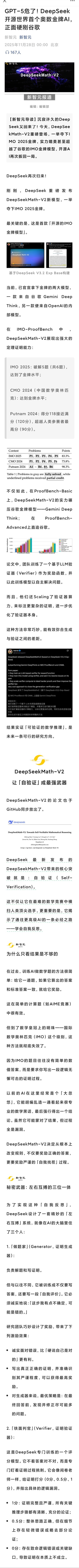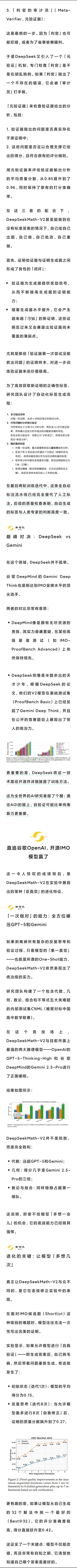 DeepSeek推出新模型GPT-5危了!DeepSeek开源世界首个奥数金牌AI,正面硬刚谷歌又是开源!数学竞赛水平和OpenAI以及谷歌一样了。但是那两家不说怎么做到的,Deepseek完全说清楚了。神秘的美国公司算法,被揭了底。而且Deepseek优化很厉害,不用靠很多GPU就行,更容易让别人学习。方法很像GAN,让生成器和判别器对抗不断提高。这里让学生做题,老师判卷,架构类似。但是最绝的是再加了个“督导”,Meta-verifier,对判卷也进行监督。三个一起提高,架构还是很清晰,符合数学规律。不仅要模仿套路做题,还要会审核过程严谨性,这就是很多一般学生和好学生的区别。好学生学到了更本质的数学内核,在老师严厉判卷下。什么学校老师水平不行,跟不上课纲,教育局会派人督导。
