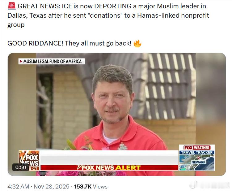ICE 在德克萨斯州达拉斯驱逐一名主要的穆斯林领袖,此前他曾向一个与哈马斯有关的非营利组织提供“捐款”。