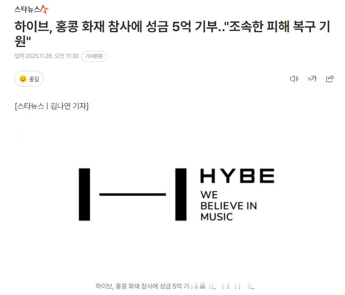 HYBE向中国香港捐款5亿韩元 hybe捐款5亿韩元28日,HYBE音乐集团APAC及其旗下6个厂牌(Big Hit Music、Belift Lab、Source Music、Pledis、KOZ、ADOR)表示:“我们向在中国香港火灾事故中不幸遇难的逝者致以深切哀悼,并向因突如其来的噩耗而深陷悲痛的所有人表达由衷的慰问。再次祈愿逝者安息,祈祷事故发生地区遭受的损失能早日获得解决与恢复。" 同时HYBE音乐集团APAC向希望桥全国灾害救助协会捐款5亿韩元(约266万港元)。相关捐款将与中国香港非营利团体一起用于支援火灾惨案遗属。