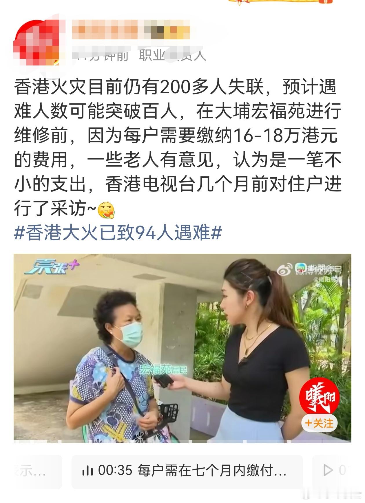香港大火已致94人遇难首先向遇难同胞致哀。然后说点别的:这次香港失火的几栋高楼,好像是在对老旧楼房的外立面进行维修或改造,当然,维修改造是对的,但为什么要对居民收钱呢?据我所知,在咱们中国大陆,所有居民楼的外立面维修和改造(包括水电暖的维修改造),可都是由政府出资的啊,记得好像是有专项资金的。没有对比,就没有伤害,“社会主义好”,这话是有道理的。