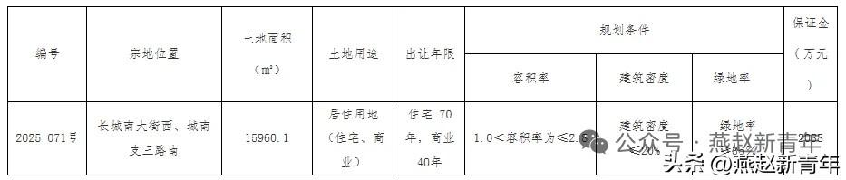 约23.94亩!保定主城区1宗居住用地拍卖出让!此次推出的地块为2025-071号,位于长城南大街西、城南支三路南,土地面积15960.1平米,约23.94亩,土地用途为居住用地(住宅、商业),1.0<容积率为≤2.8。